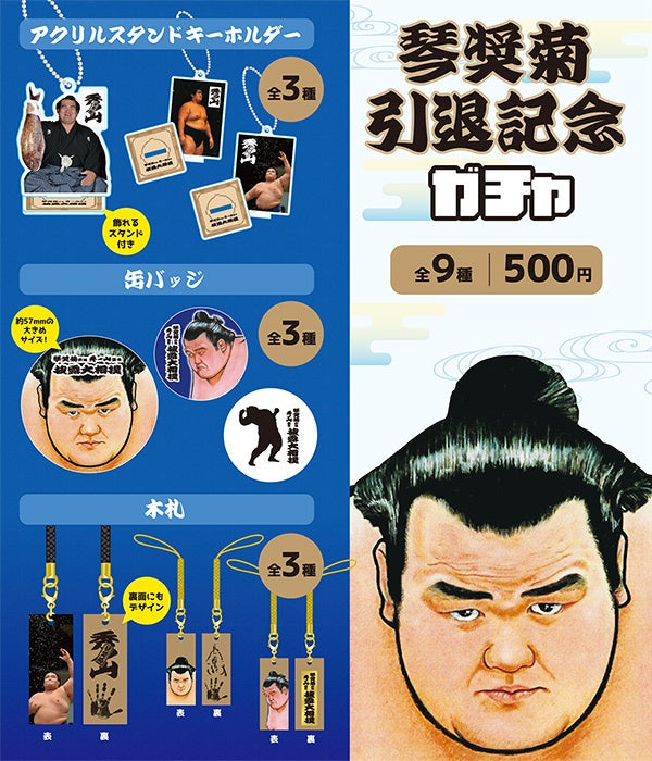 館内では、この日のために制作された、飾れる台座付・想い出の写真アクリルスタンドキーホルダー全3種、琴剣氏イラストや琴バウアーのシルエットの缶バッジ全3種、特製木札キーホルダー全3種をはじめ、直筆サイン入りポスター、手形付サイン色紙他スペシャルな賞品が当たるガチャも出展予定です。