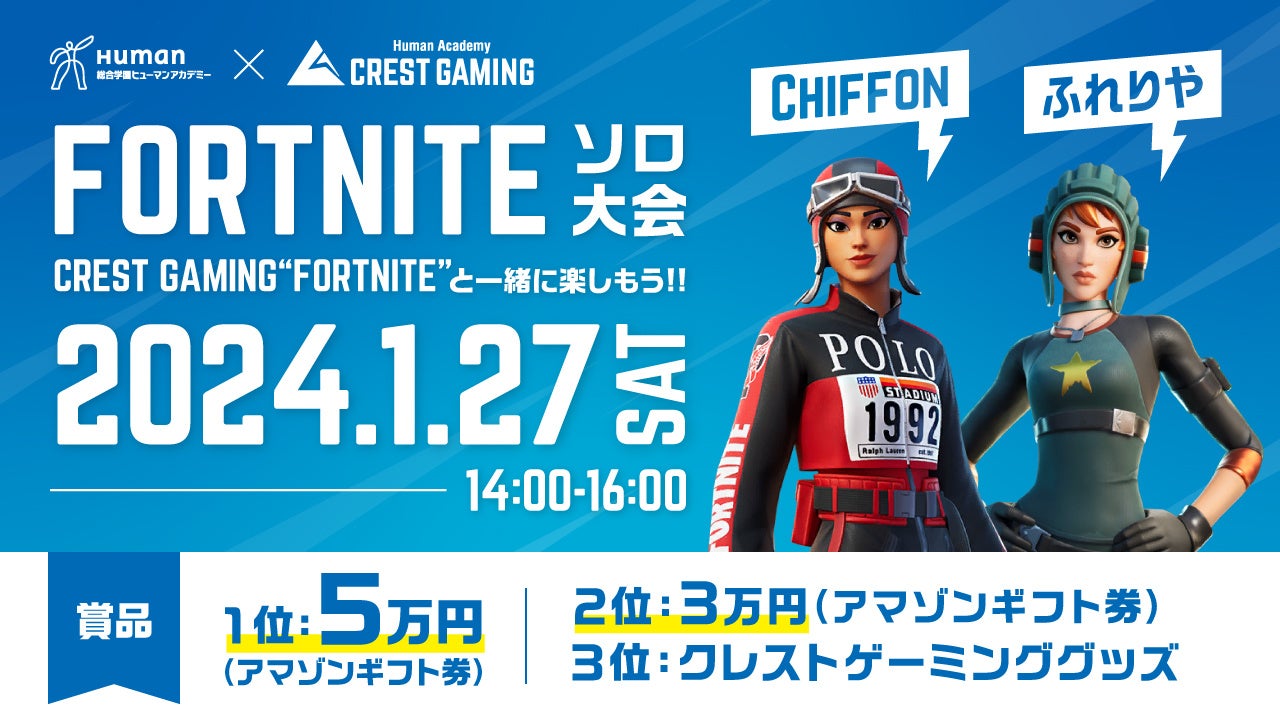 教育事業を手掛けるヒューマンアカデミー株式会社(本社:東京都新宿区、代表取締役:川上 輝之、以下「当社」)が運営する全日制専門校の総合学園ヒューマンアカデミーe-Sportsカレッジにて、世界で活躍するプロ選手を育成する一貫として、プロeスポーツチーム「Human Academy CREST GAMING "FORTNITE"」より、Chiffon選手、ふれりや選手を迎えた、「FORTNITE 」を開催します。プロのeスポーツ選手と一緒に楽しめるこの大会は、eスポーツに未来を感じ、スキル向上を目指す方にとって実践的な技術を磨くことができるイベントとなります。