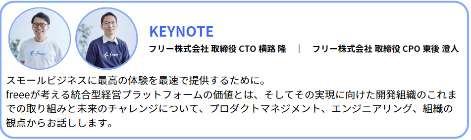 6月1日(土)のキーノートセッションでは、CTO(Chief Technology Officer)の横路とCPO(Chief Product Officer)の東後が登壇し、freeeが考える統合型経営プラットフォームの価値、そしてその実現に向けた開発組織のこれまでの取り組みと未来のチャレンジについて、プロダクトマネジメント、エンジニアリング、組織の観点からお話しします。