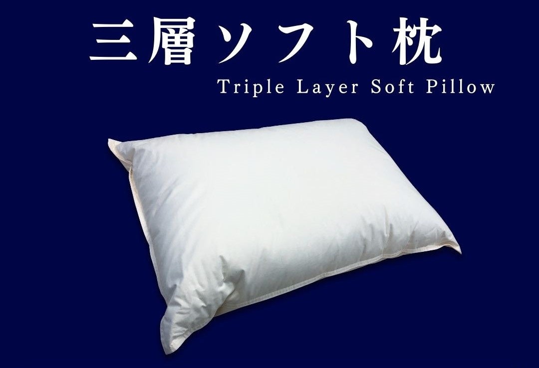 【三層ソフト枕】枕の表面の中身に通気性、柔軟性があり、吸湿効果の高いポリエチレン発砲素材(ミラウェーブ)を使った清潔で柔らかく弾力のある中材がやさしく、適度な沈み込みで後頭部と頸椎を包み込んで、心地よい眠りに導いてくれる枕です。