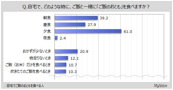 ご飯のおともを食べる場面は(複数回答)、「夕食」がご飯のおともを食べる人の61.0%、「朝食」が39.2%、「昼食」「おかずが少ないとき」が各20%台です。