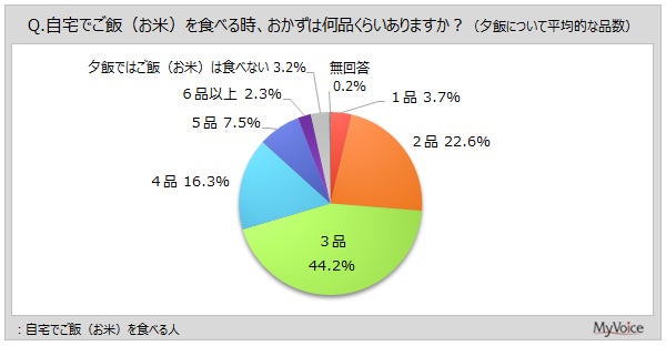自宅でご飯を食べる人に、夕飯のおかずの品数を聞いたところ、「3品」が44.2%でボリュームゾーンです。4品以上は3割弱となっています。