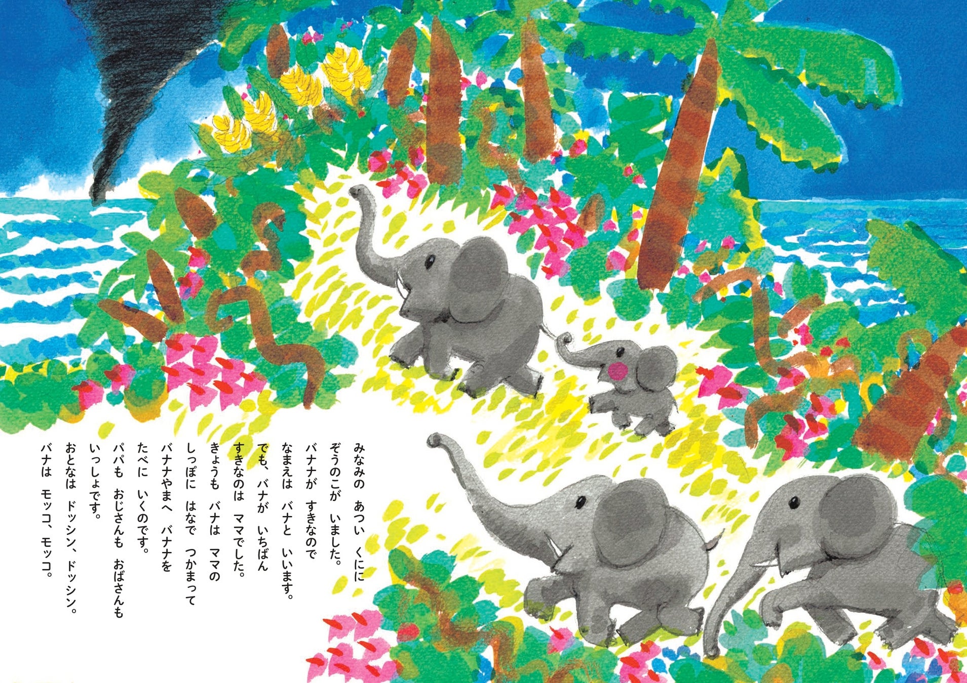 | みなみの あつい くにに ぞうのこが いました。バナナが すきなので なまえは バナと いいます。 でも、バナが いちばん すきなのは ママでした。 |