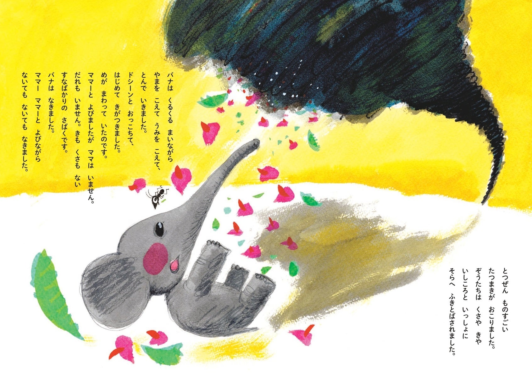 | とつぜん ものすごいたつまきが おこりました。ぞうたちは くさや きや いしころと いっしょに そらへ ふきとばされました。 …………………… ママーと よびましたが ママは いません。だれも いません。きも くさも ない すなばかりの さばくです。 |