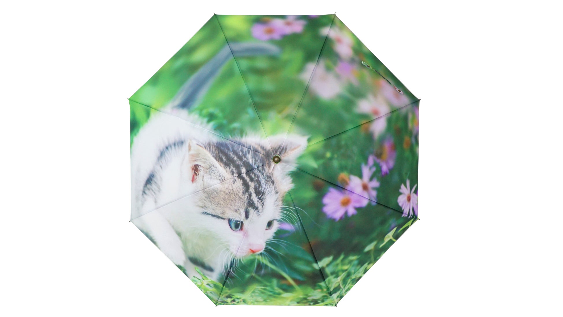 様々な種類の猫や犬などの写真が傘一杯にプリントされています。