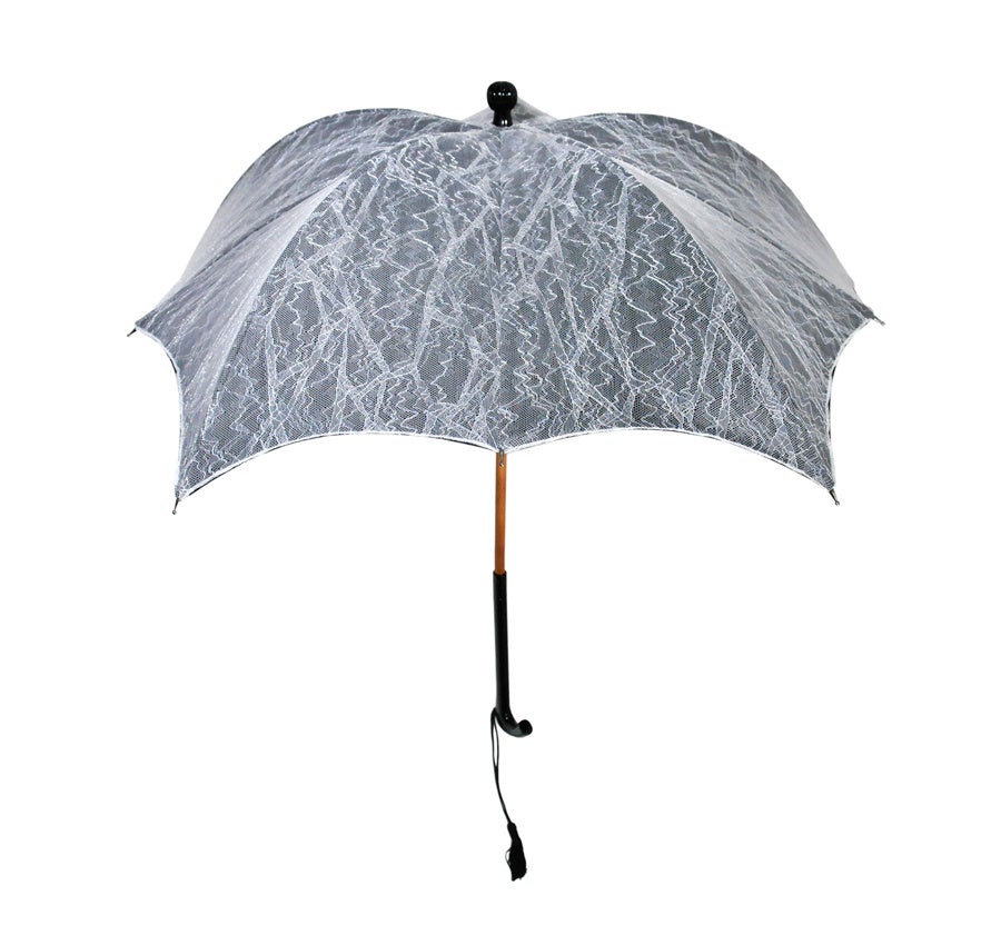 かぼちゃの形をモチーフにした立体的なフォルムの日傘は、繊細なレースを纏わせた贅沢な一品です。ハンドルと石突をブラックのアクリルにするなど、遊び心を添えたデザインに作り手のセンスを感じます。