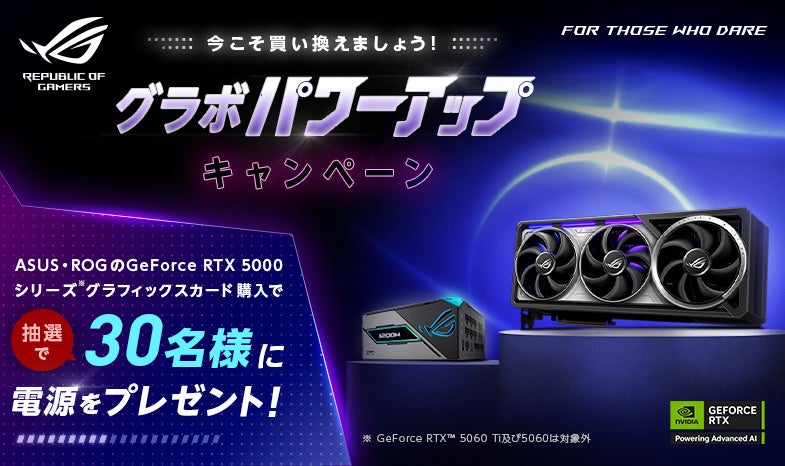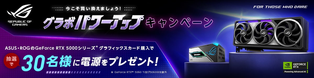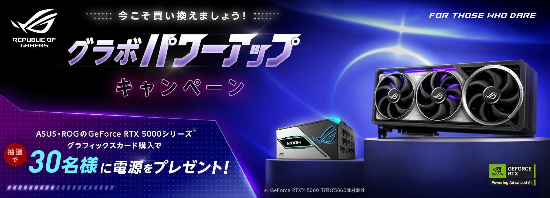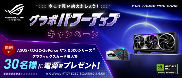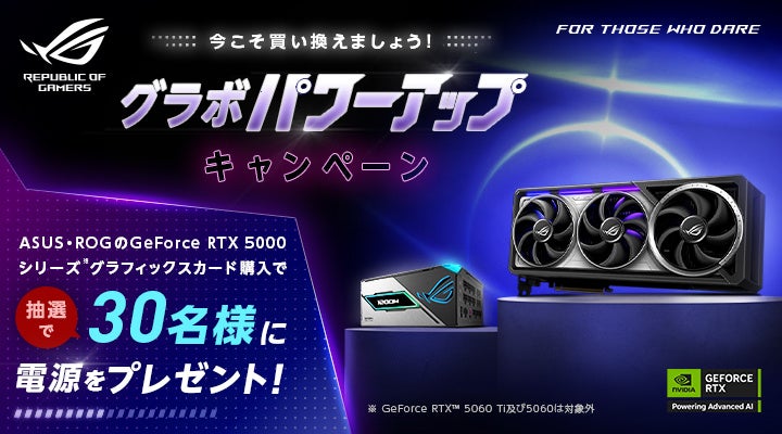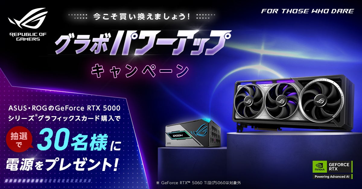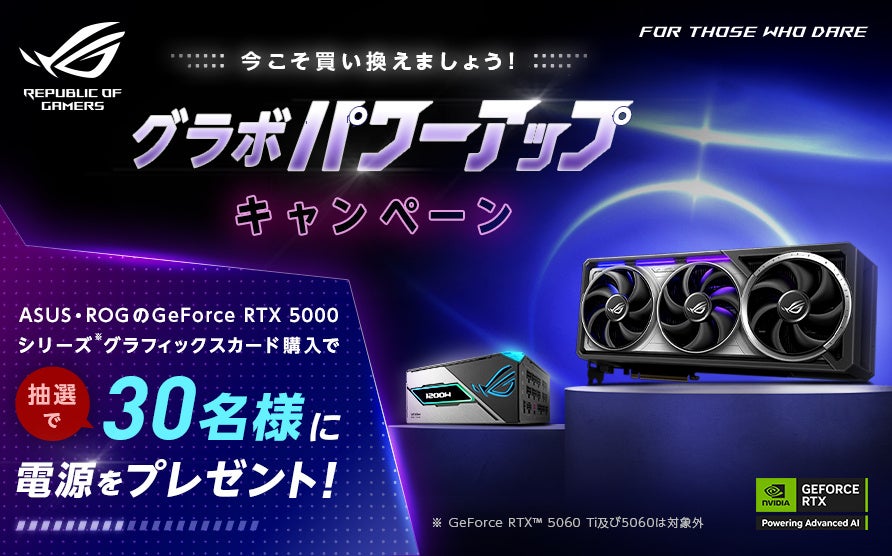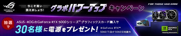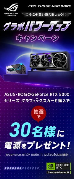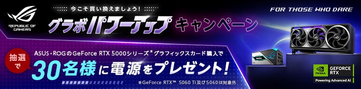 ASUS JAPAN株式会社は、対象のGeForce RTX 50シリーズのASUS・ROGグラフィックスカードを購入すると抽選で電源がもらえる「グラボパワーアップキャンペーン」を開催します。