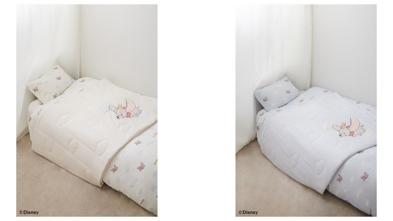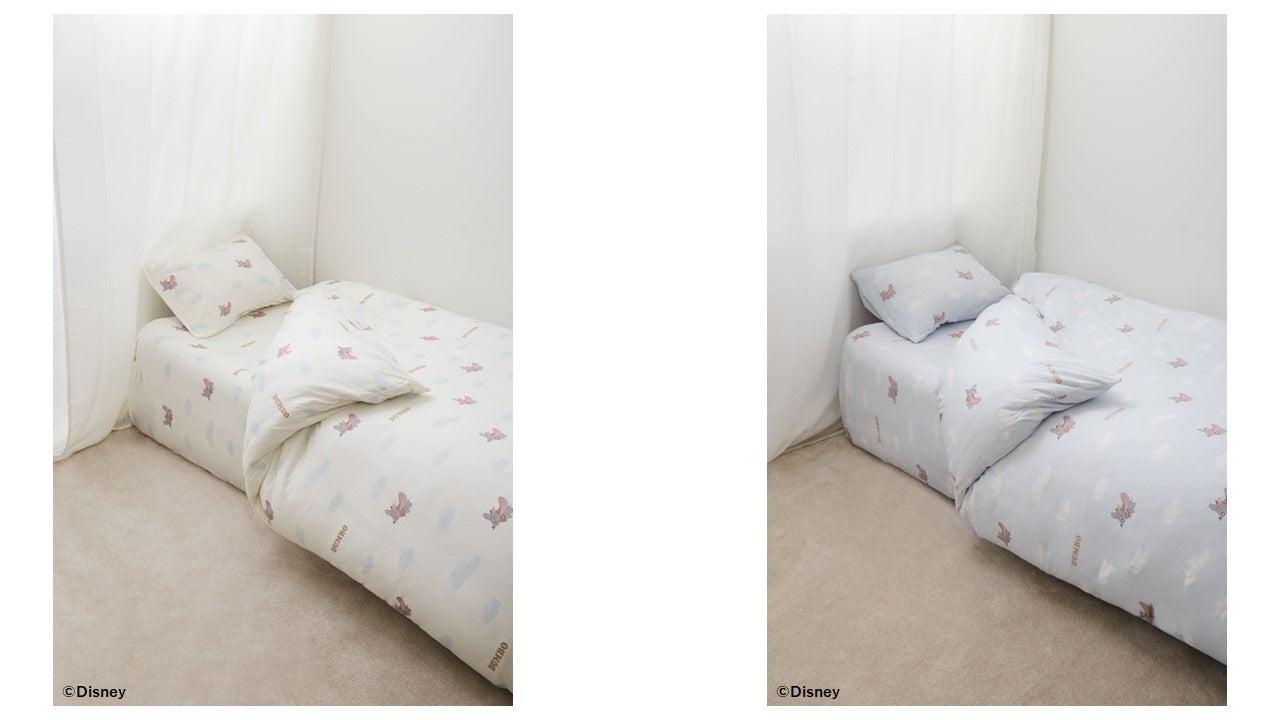 ダンボと一緒に空を飛んでいるような夢心地にしてくれる、さらりとした肌ざわりが気持ち良い寝具セットや抱き枕など計8型を展開。