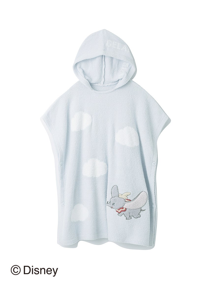 雲モチーフのジャガードに、空飛ぶダンボをモコモコ素材でアップリケ刺繍したポンチョ。