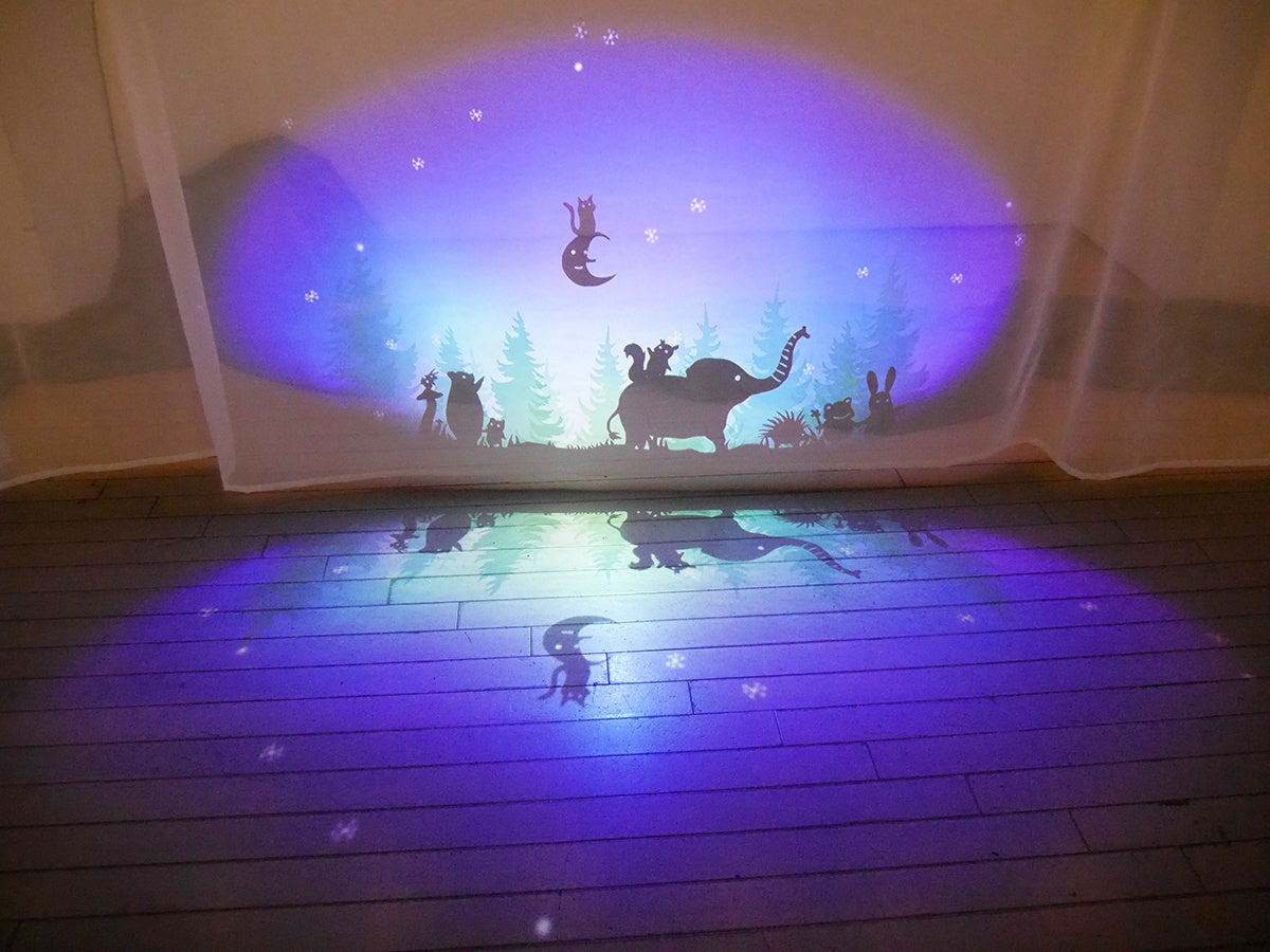 そして、第4章は「森のパーティーにご招待」。12月25日までは限定開催の「クリスマスパーティー」仕様になっています。クリスマスツリーが飾られていたり、森の仲間たちがロマンティックな夜空の下を歩く作品がアニメーションとして楽しめます。リト氏も「自分では、こんな素敵な映像、空間演出を考えたことがなかったので勉強になりました」と語るほどの出来映え。この期間は来場特典もクリスマス仕様になっているそう。12月26日からは、焚き火を活かした仕様に様変わりするそうなので、お好みのタイミングで足を運んでみてください。