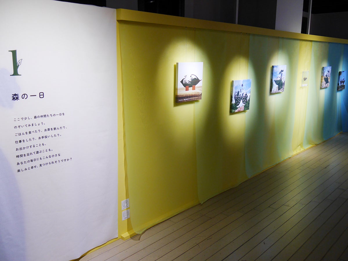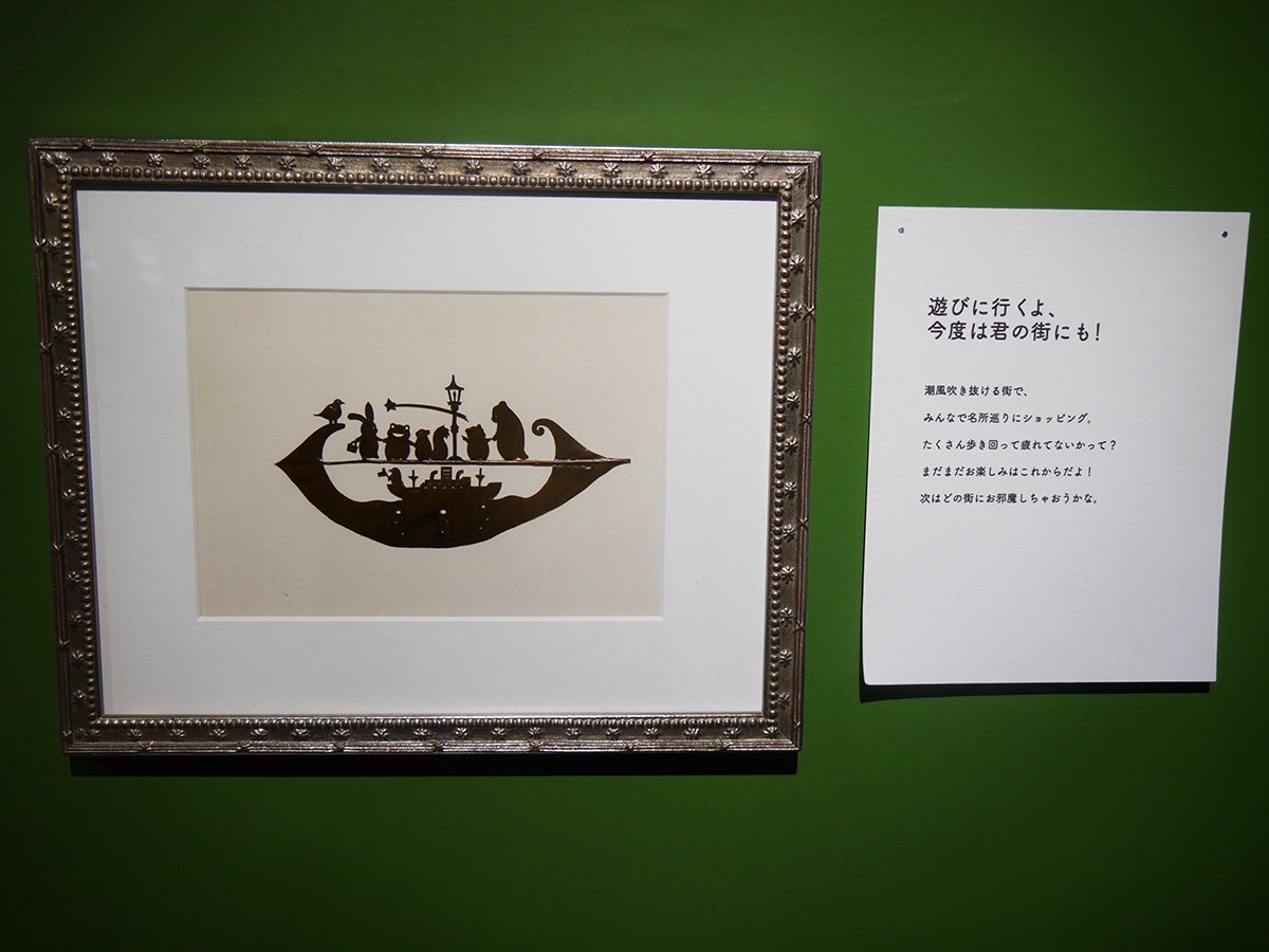 早速、会場に入り、切り絵の小道を抜けて第1章「森の一日」へ。森の仲間たちがごはんを食べたり、仕事をしたり、お出かけをしている模様をのぞくことができます。個人的には、「ボクたちの笑顔、分けてあげるね」でブランコに乗っている仲間たちを描いた切り絵の技術に圧巻。「手と手を繋いだらもう お友達だね」では、手がしっかりと繋がれている姿に心がほっこりしました。