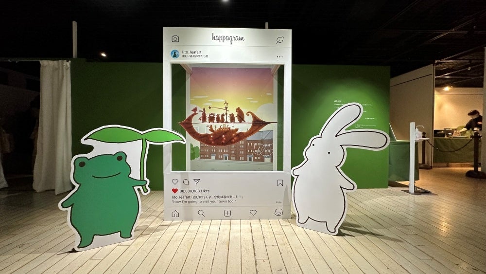 最後のエリアには、ウサギくん、カエルくんと撮影ができる「happagram」なるフォトスポットが登場。その隣には、神社をテーマにした作品を再現した「森のウサギ神社」が。リト氏によると「葉っぱの形をしたメモ帳に2023年の願いごとや目標を書いて、さい銭箱に入れてもらうというちょっとした遊びです。来年は卯年ということで、作品ではウサギくんが鈴を鳴らしています」とのこと。作品を見ながら、記念にぜひ試してみてください。