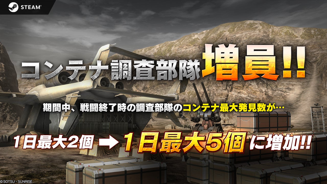 キャンペーン期間中は、戦闘に3回出撃する度に、調査部隊のコンテナ発見率が100%となりますので、是非この機会にプレイしてみてください!