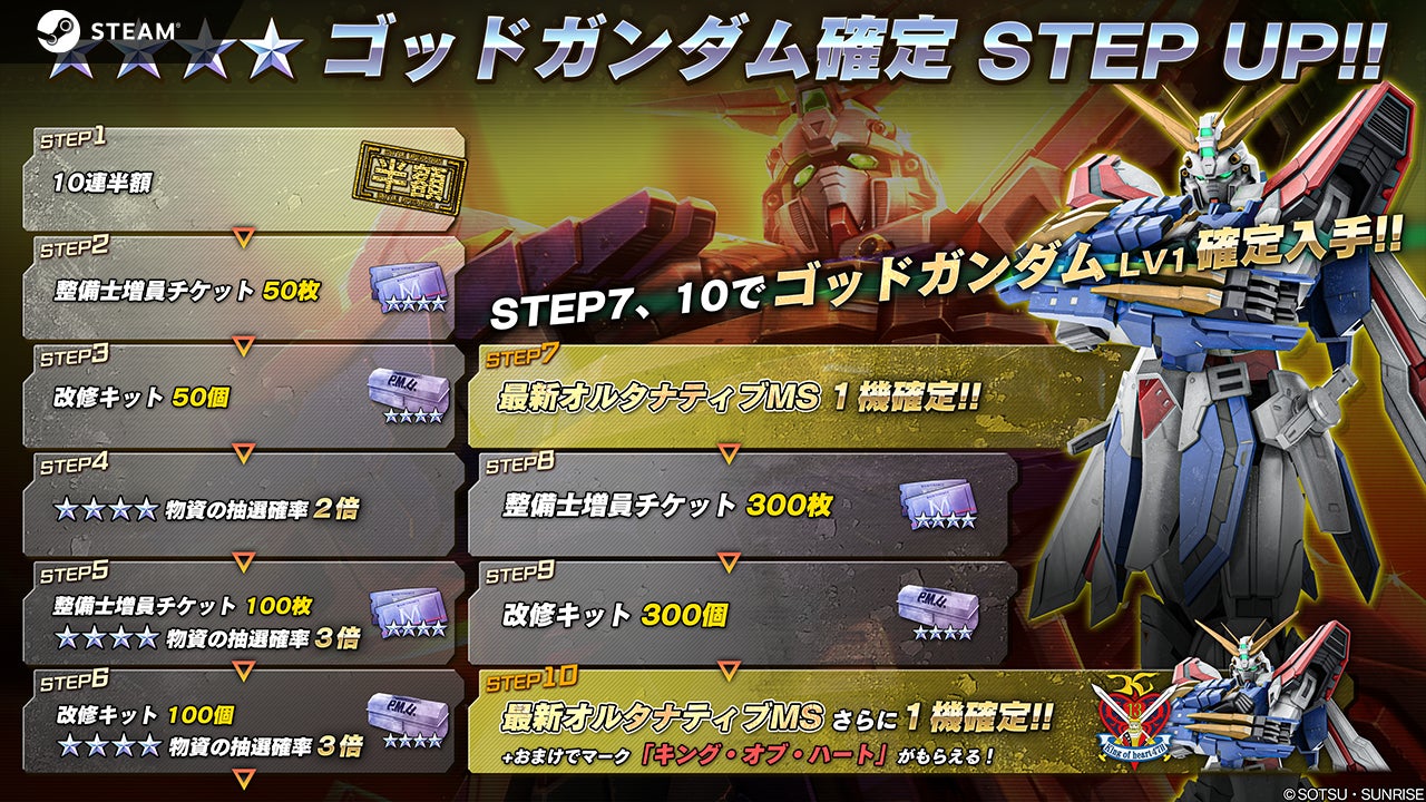 STEP7、STEP10で「ゴッドガンダム LV1」が確定で手に入るゴッドガンダム確定STEP UP抽選配給も