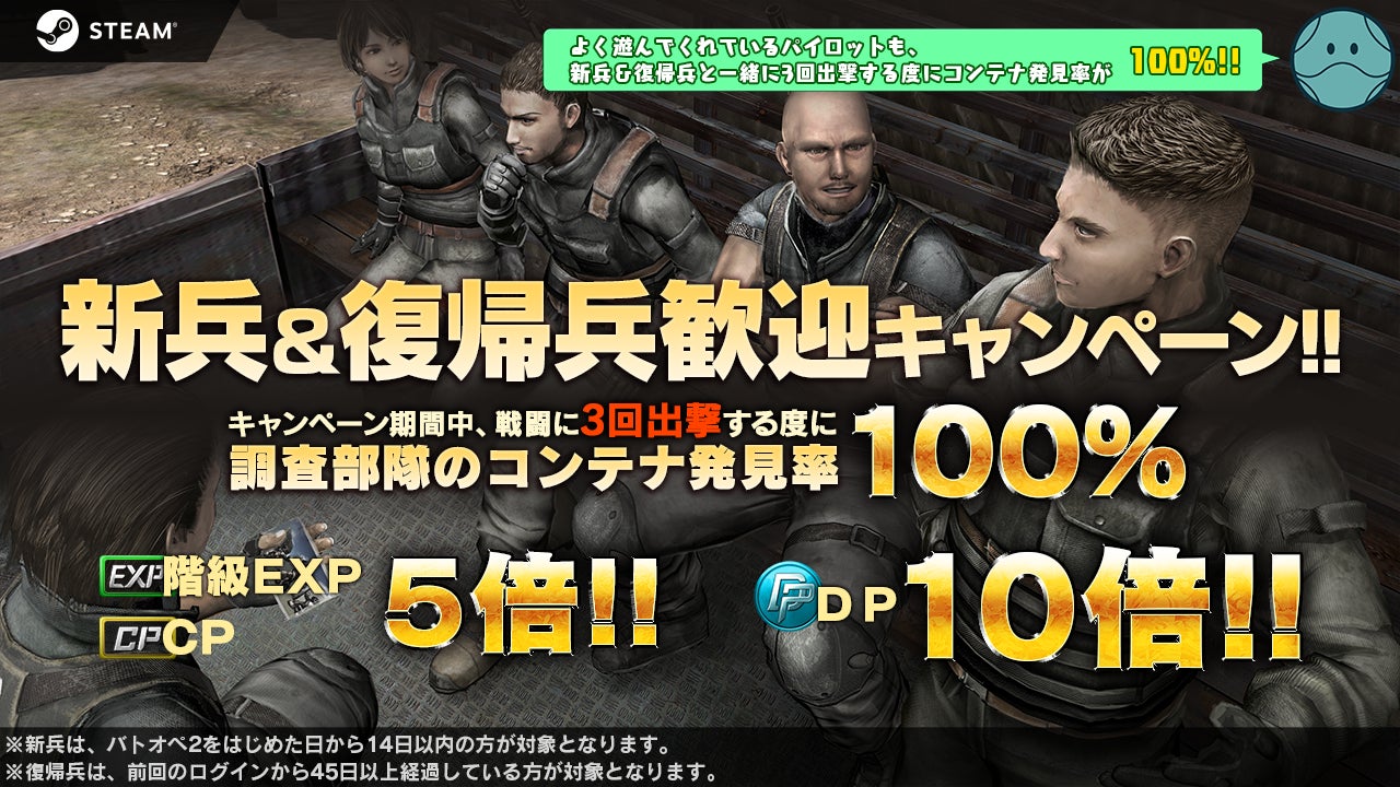 『バトオペ2』をはじめた日から14日以内の新兵と『バトオペ2』に45日以上ログインしていなかった復帰兵は基本報酬のEXP、CPが5倍になり、DPは10倍となる新兵&復帰兵歓迎キャンペーンを実施します。