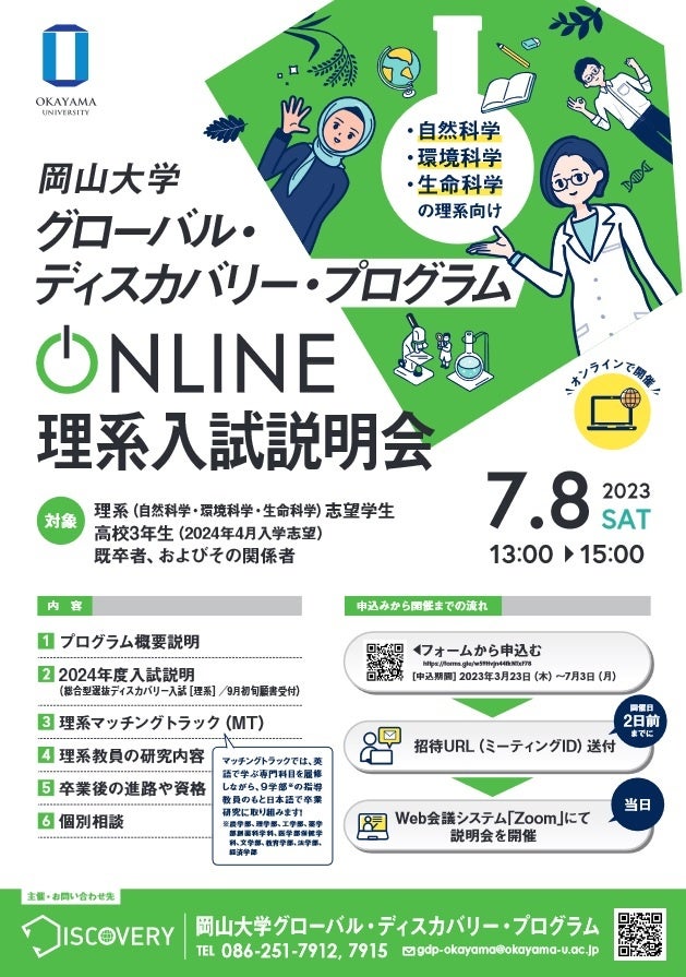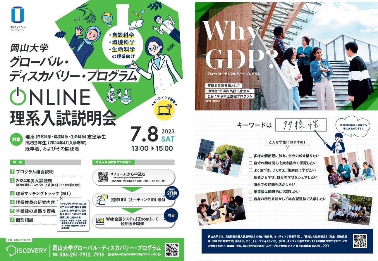 【岡山大学】グローバル・ディスカバリー・プログラム(GDP)オンライン理系入試説明会〔7/8,土 オンライン開催〕