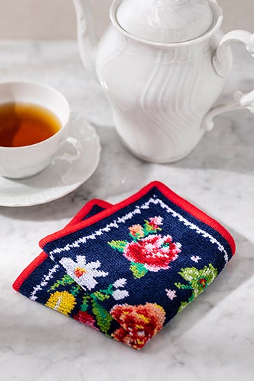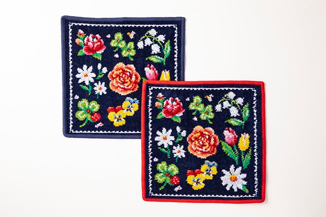 毎日連載「365日 花散歩に出かけよう」や、人気フローリスト藤野幸信さんの連載「季節の贈り花」など、家庭画報.comでは“花のある暮らし”を提案しています。ハンカチのデザインには、バラ、クローバー、スズラン、デイジー、ラナンキュラス、チューリップ、パンジー、マーガレットと、誰からも愛される草花をセレクトしました(上段左から。重複するものは除く)。同じデザインで、縁どりの色が異なる「レッド」と「ネイビー」の2種類を用意しています。