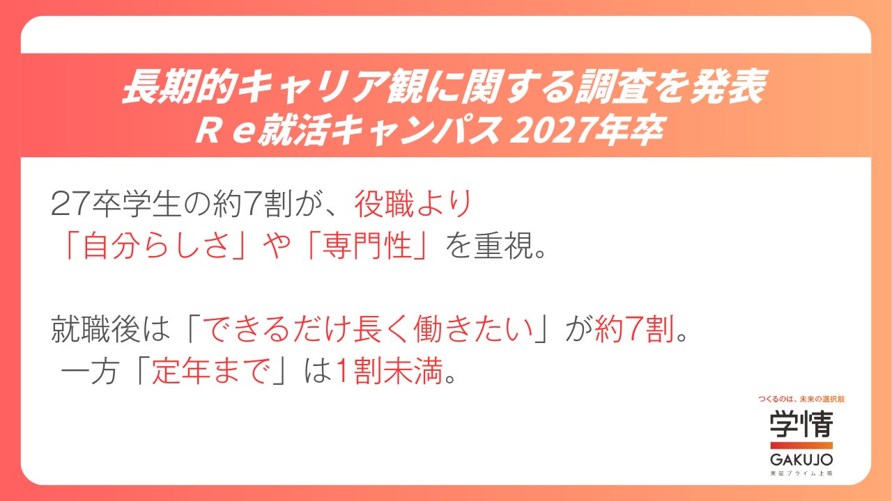 こうした状況を踏まえ、本調査では、2027年卒業予定の学生を対象に、キャリアの考え方や、就職後の働き方に対する意識について調査を実施しました。