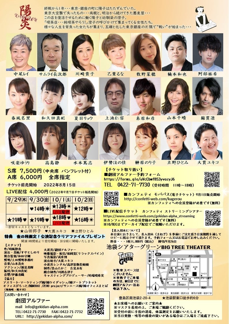 劇団アルファー(代表:酢屋 敏徳)主催、第 34 回池袋演劇祭参加作品 劇団アルファーvol.38『陽炎』が2022年9月29日 (木) ~2022年10月2日 (日)にシアターグリーン BIG TREE THEATER(東京都豊島区南池袋2-20-4)にて上演されます。