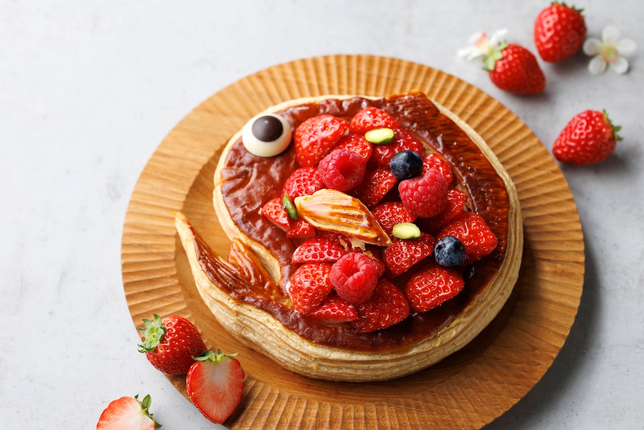 フランスのユニークな習慣にちなんで、表情やヒレなど、見た目も可愛らしく仕上げた魚形のパイをご用意しました。パイの中には、濃厚なカスタードクリームとフルーツをたっぷりとつめて、旬のいちごやベリーをトッピングしました。ベリーの程よい酸味がカスタードクリームの甘さを引き立てます。シェラトン都ホテル東京がお届けする「ポワソン・ダブリル」をご自宅でお楽しみください。