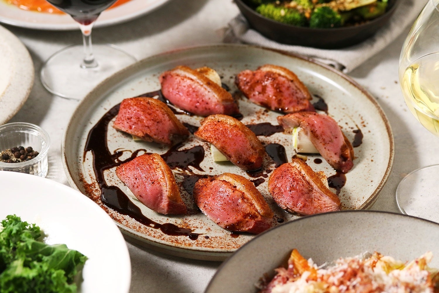 ・合鴨胸肉のローストと焼き葱 柑橘香るバルサミコソース