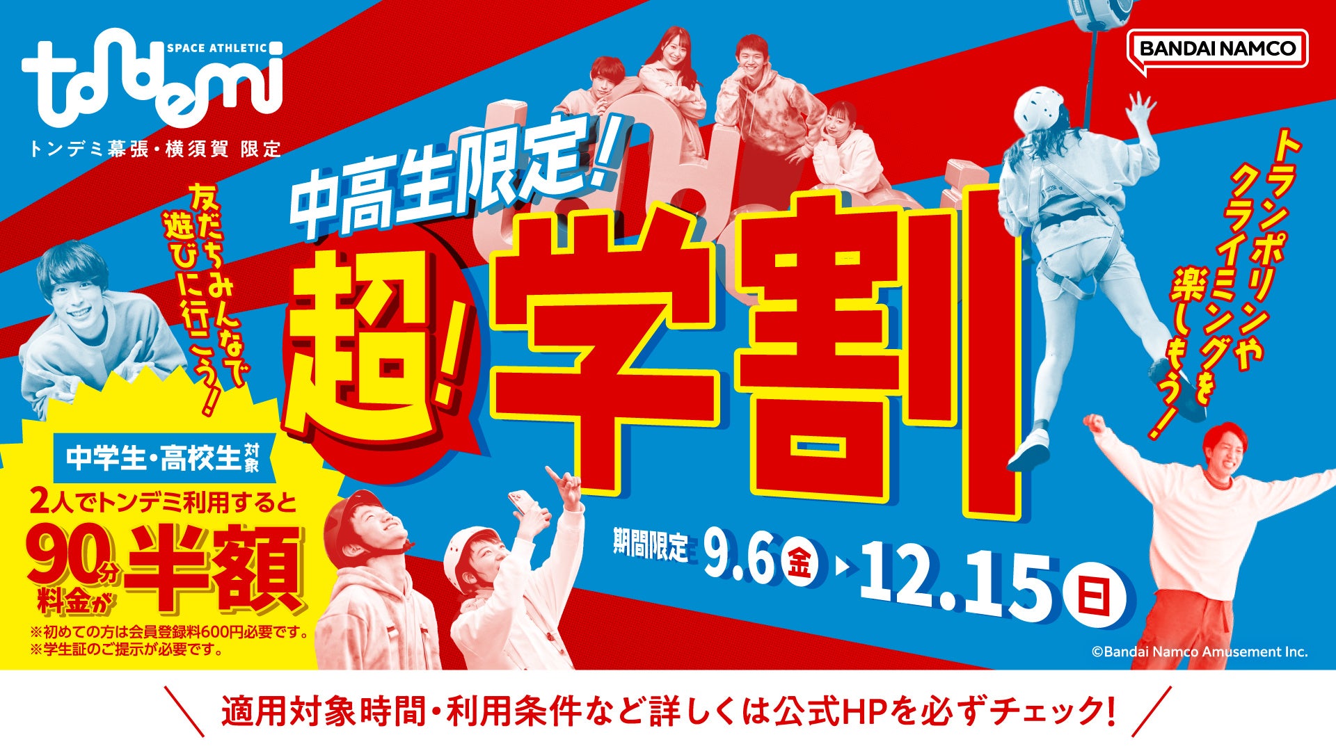 株式会社バンダイナムコアミューズメントは、屋内アスレチック施設「トンデミ幕張」「トンデミ横須賀」にて、2024年9月6日(金)から12月15日(日)の期間中、平日終日・休日16時以降に2人以上でトンデミを利用すると90分料金が半額になる中高生限定「超!学割」(※1)を実施します。