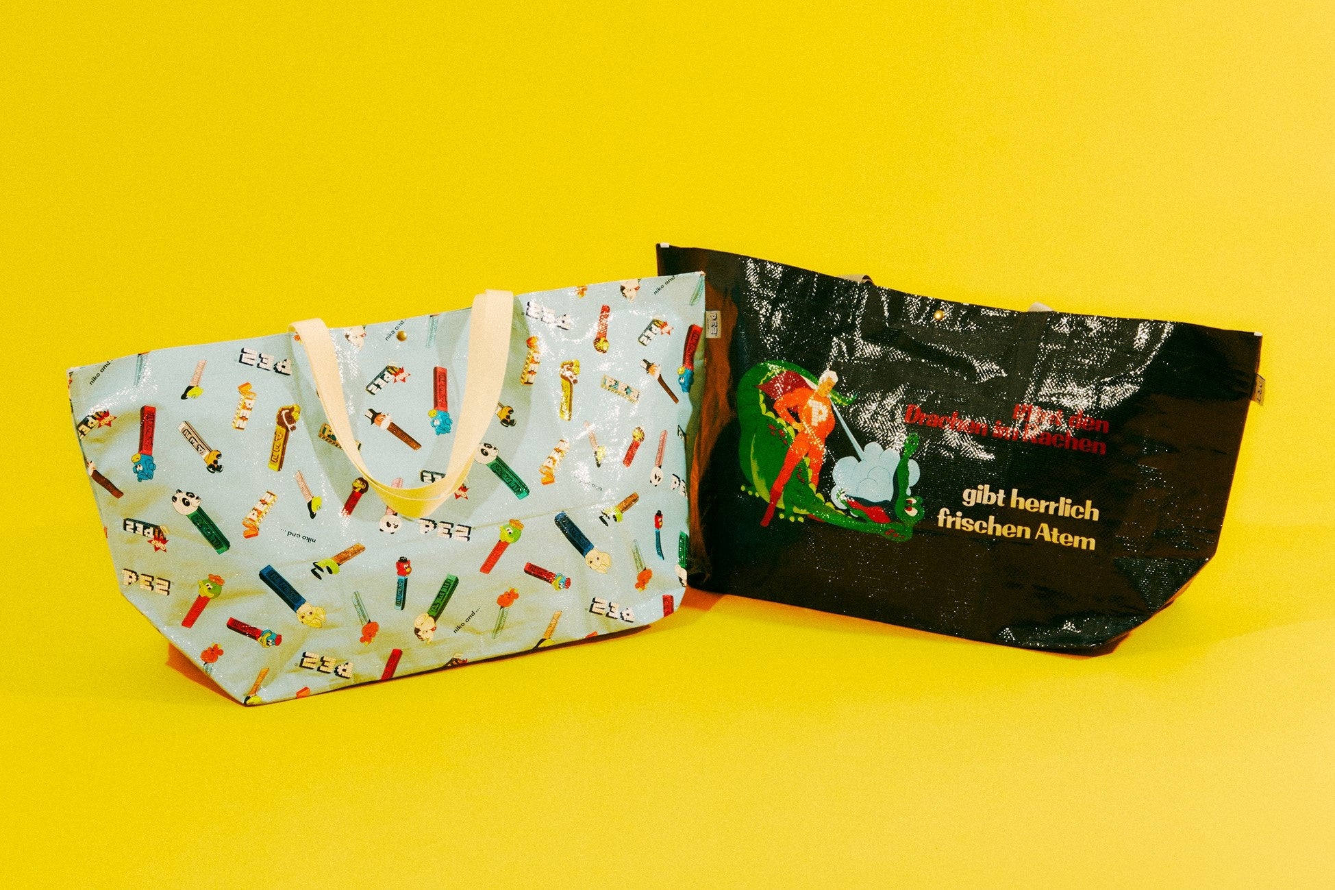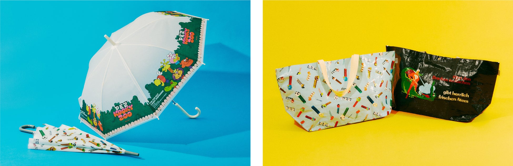 (左)商品名:PEZコラボビニール傘 各¥1,320/(右)商品名: PEZコラボPPバッグ 各¥1,760