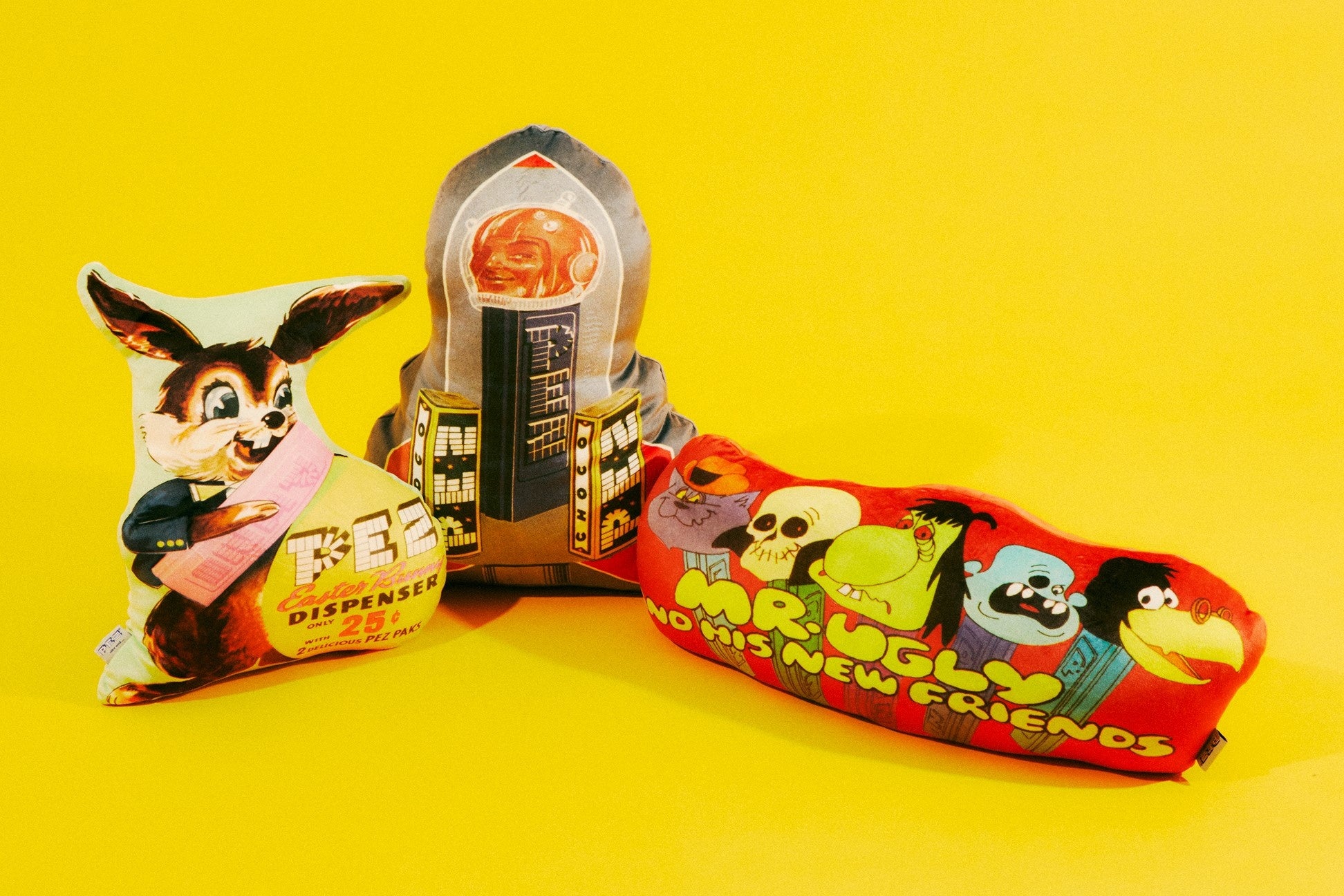 (左)商品名:左から順番に、・PEZコラボもちもちクッションB ¥2,420・PEZコラボもちもちクッションC ¥2,640・PEZコラボもちもちクッションA ¥2,640