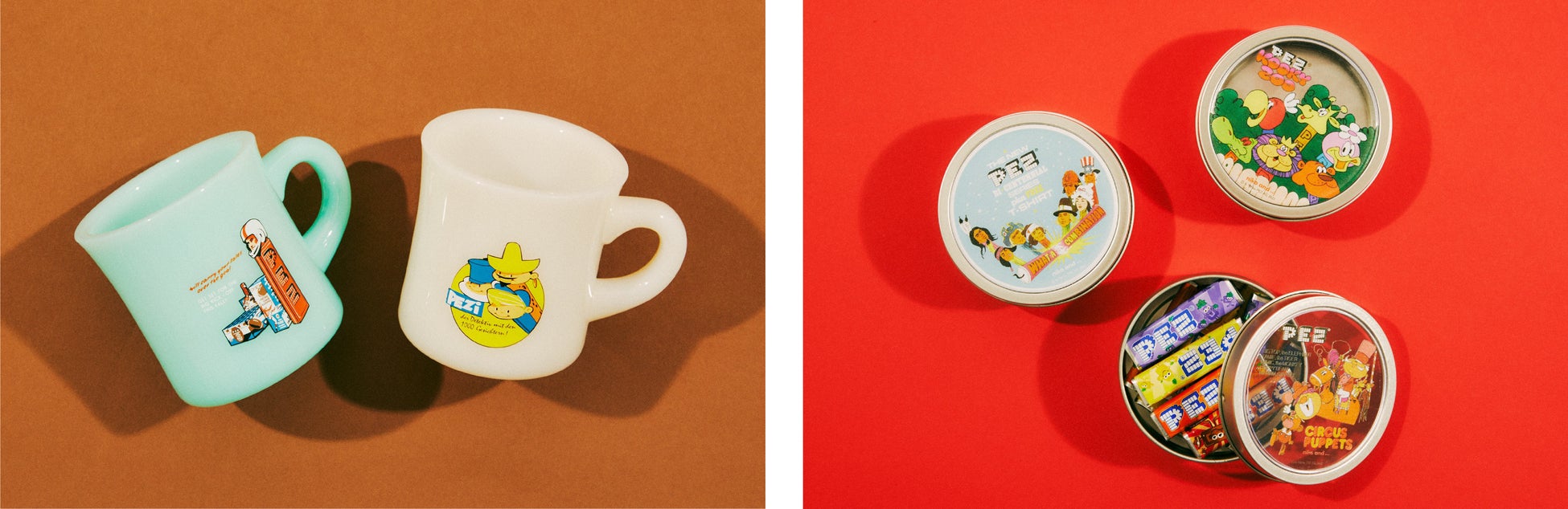 (左)商品名:PEZコラボクリアマグ 各¥1,320/(右)商品名: PEZコラボマグネット3Pボックス ¥1,540