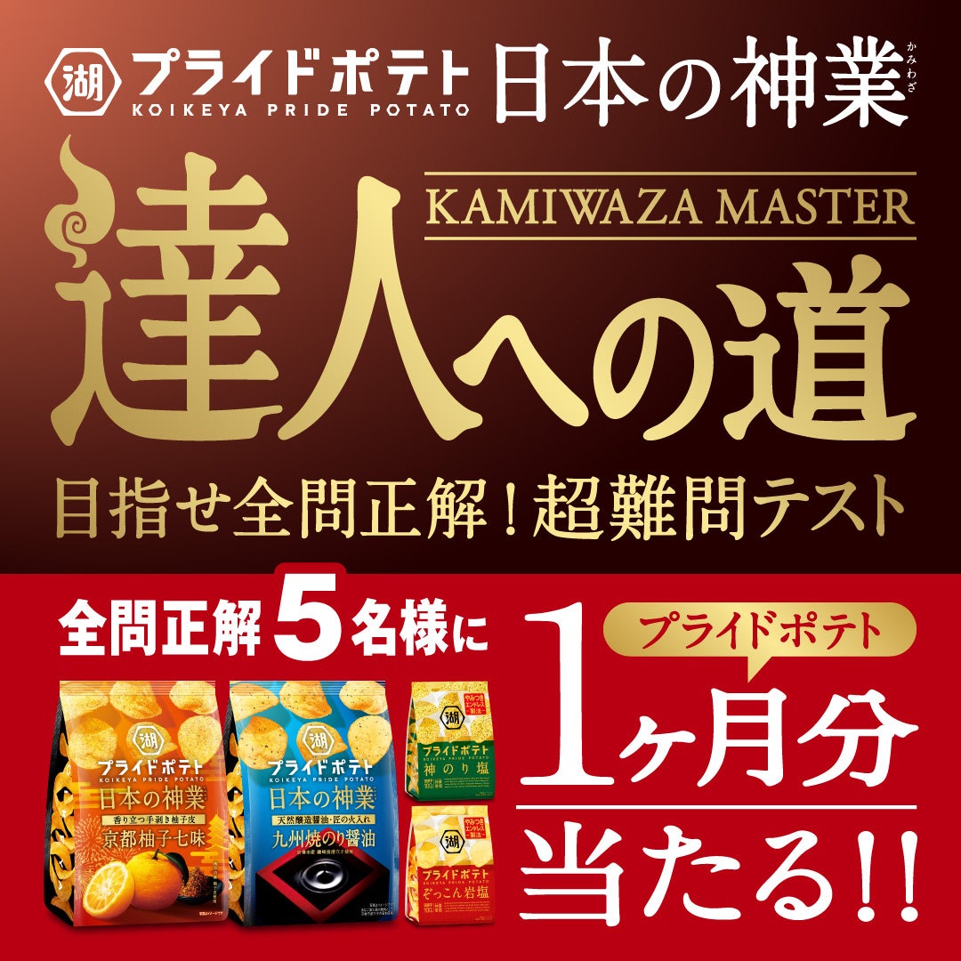 当キャンペーンでは、「湖池屋プライドポテト 日本の神業 京都柚子七味」、同時発売される「湖池屋プライドポテト 日本の神業 九州焼のり醤油」に関する超難問クイズに挑戦していただき、見事全問正解された方の中から抽選で5名様が当選となります。当選者の方には「湖池屋プライドポテト 日本の神業」第2弾2品(京都柚子七味・九州焼のり醤油)と「湖池屋プライドポテト」定番2品(神のり塩・ぞっこん岩塩)を各8袋の詰め合わせにし、たっぷり1ヶ月分(計32袋)をプレゼントします。