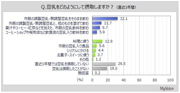 摂取方法は(複数回答)、「市販の調製豆乳・無調整豆乳をそのまま飲む」が32.1%です。