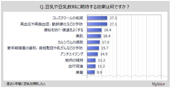 【豆乳に関する調査】直近1年間に豆乳の飲料や食品を摂取した人は5割強。期待する効果は「コレステロールの低減」「高血圧や高脂血症、動脈硬化などの予防」が各3割弱