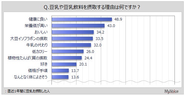 直近1年間に豆乳を摂取した人の摂取理由は(複数回答)、「健康に良い」が48.9%、「栄養価が高い」が43.0%、「おいしい」「大豆イソフラボンの摂取」「牛乳の代わり」が各3割強です。