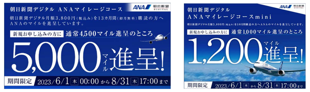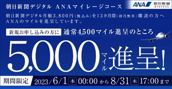株式会社朝日新聞社(代表取締役社長:中村史郎)が提供する「朝日新聞デジタル ANAマイレージコース」と「朝日新聞デジタル ANAマイレージコースmini」で、ボーナスマイルキャンペーンを2023年6月1日(木)~8月31日(木)17時まで実施しています。