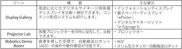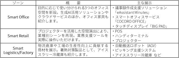 今回、「体験ゾーン」を刷新。実際の利用シーンをイメージしながら、各種商材を確認いただけます。「Smart Office」ゾーンでは、目的に応じた3つのオフィス空間を新設しました。スマートオフィス関連の各種商材のほか、オフィス家具も紹介。重要会議やブレストなど、用途に応じたオフィス作りを提案します。「Smart Retail」では、プロジェクターによる空間演出も活用し、店舗や商業施設など業種別のシーンを再現。POSやハンディターミナルなど業務支援ツールを紹介します。「Smart Logistics/Factory」では、自動搬送ロボット(AGV)やピッキング支援システムなど、物流倉庫や工場の生産性向上に貢献する商材を展示。暑熱対策製品として、アイススラリー冷蔵庫も紹介します。また、「ラボゾーン」を新設。業務用ディスプレイ、プロジェクターやAGVなど、各種商材の使用感を確認しながら、比較・検討いただけます。