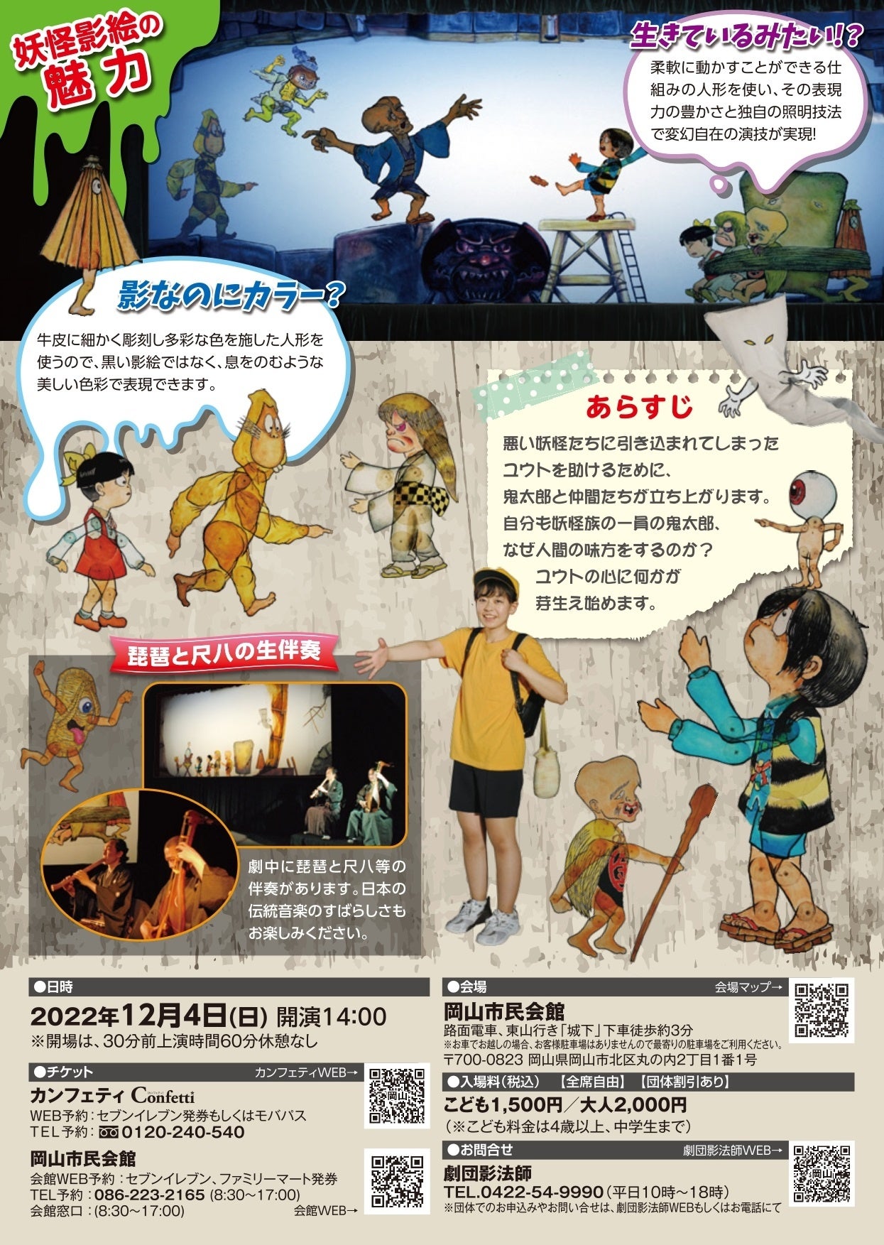 株式会社劇団影法師 妖怪影絵劇「ゲゲゲの鬼太郎」【岡山公演】が2022年12月4日 (日) に岡山市民会館 大ホール(岡山県岡山市北区丸の内2-1-1)にて上演されます。