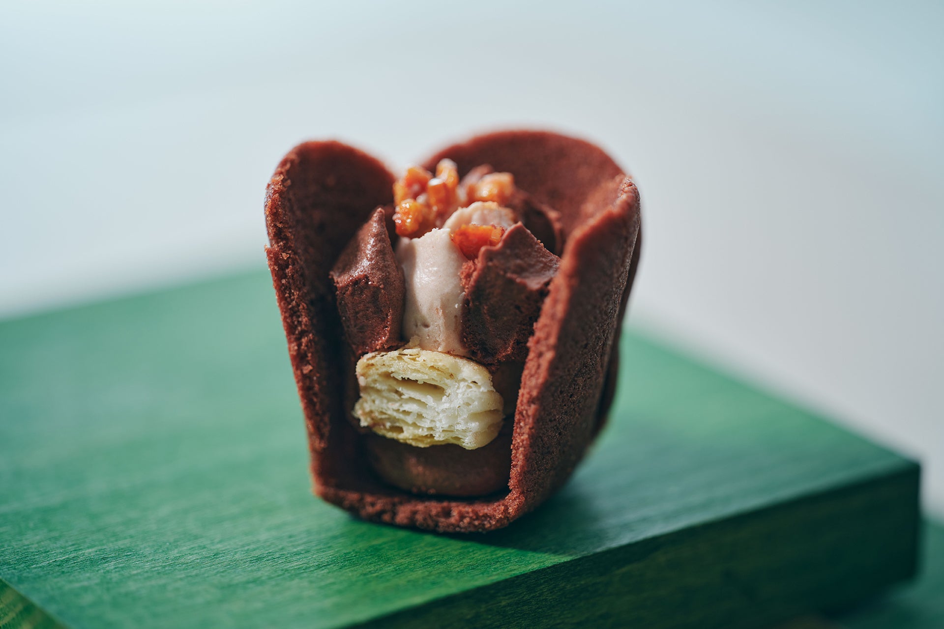 ミシュランシェフ御用達のブルターニュ産発酵バターを使用したラングドシャクッキーに、きめ細やかで軽い口どけに仕上げた2つのショコラクリームを絞りました。クリーミーさとコクをたっぷり味わえる北海道産ミルク仕立てのホワイトショコラクリーム。さらに、宮古島の雪塩が隠し味の香ばしい塩バターキャラメル風味のクリームでミルクのコクを深めています。ボトムに潜ませたパイの塩味もコクを引き締める名脇役です。
