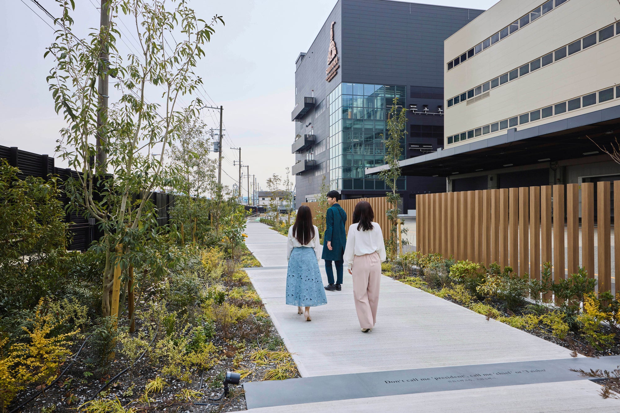「スピリッツ・リキュール工房」へのアプローチである「ボタニカルロード」には、「ROKU〈六〉」に使われる素材と同品種である大島桜や八重桜、ジンのボタニカルであるジュニパーベリーやレモン、ビターオレンジなどさまざまな植物が植えられています。「ボタニカルロード」の足元には、創業者・鳥井信治郎のことばが刻まれています。