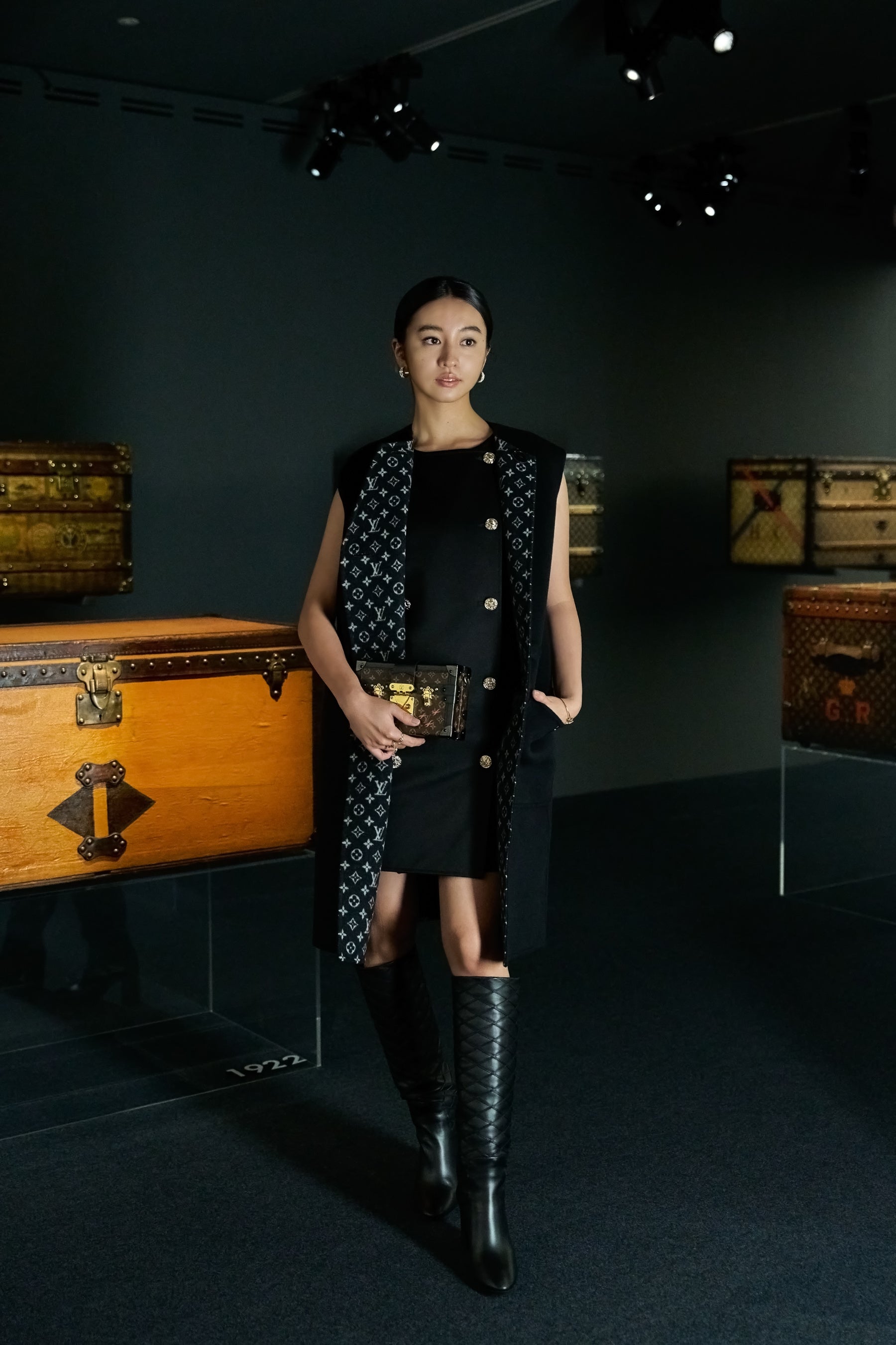 アニエール訪問時、Kōki,は2024秋冬シーズンの新作スリーブレスダブルフェイスコートを着用し、ルイ・ヴィトンのトランク作りの伝統から着想を得たディテールが光るバッグ「プティット・マル」を合わせました。
