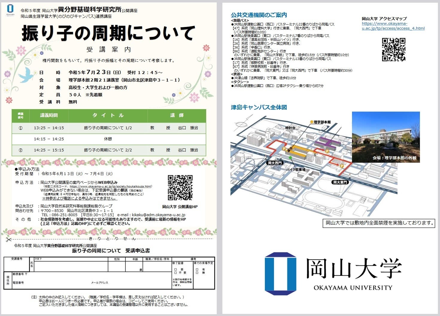 下記の岡山大学公開講座の案内ページからWEB申込みをお願い申し上げます(~7月4日(火))。