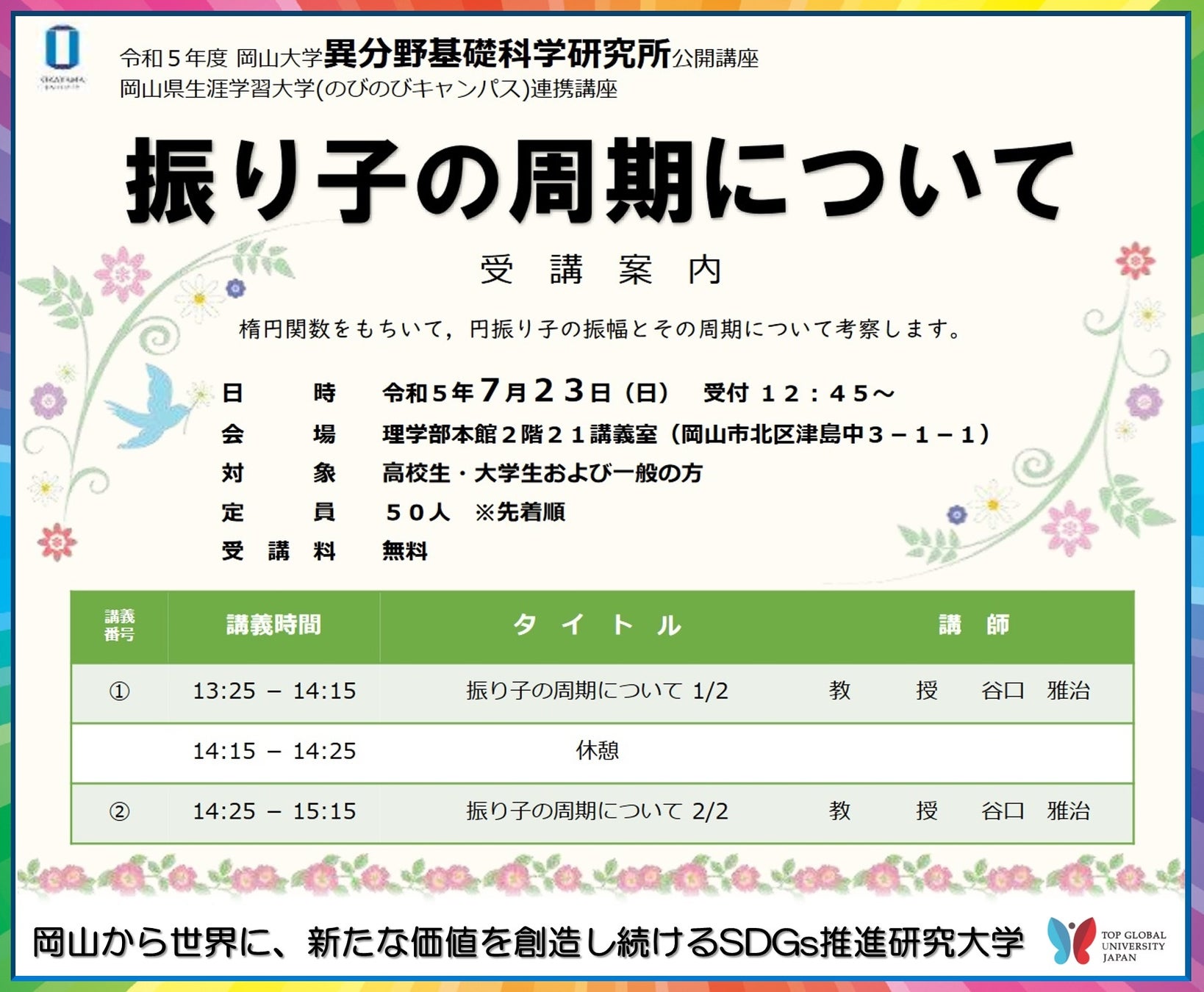 【岡山大学】異分野基礎科学研究所公開講座「振り子の周期について」〔7/23,日 岡山大学理学部本館〕