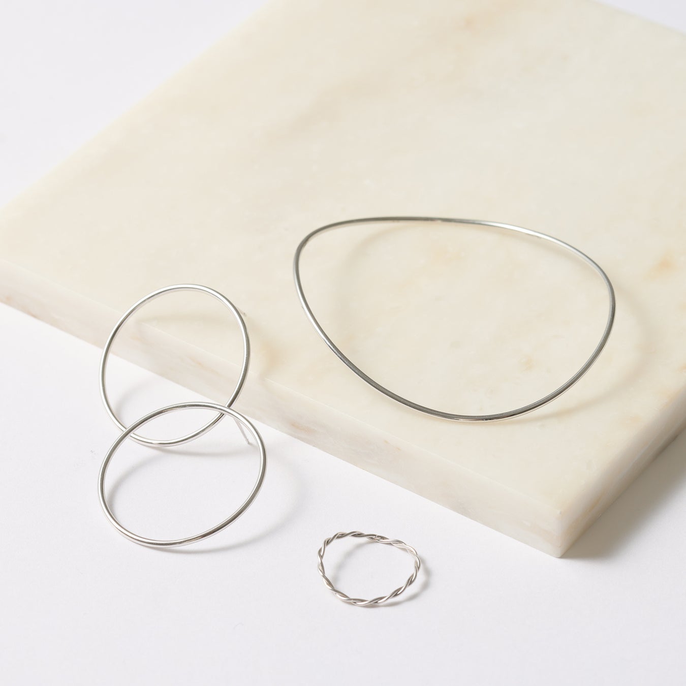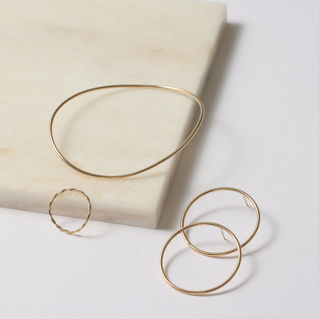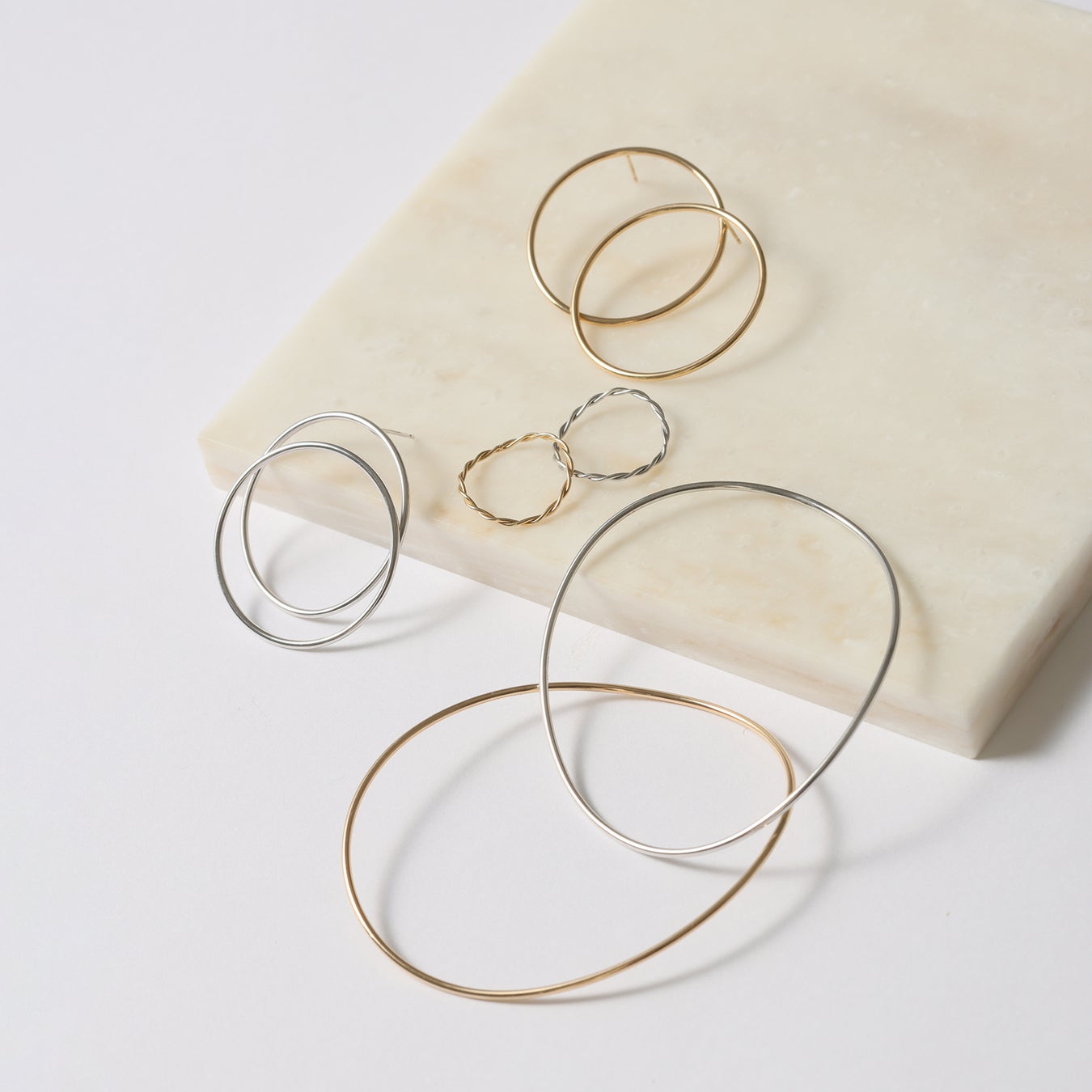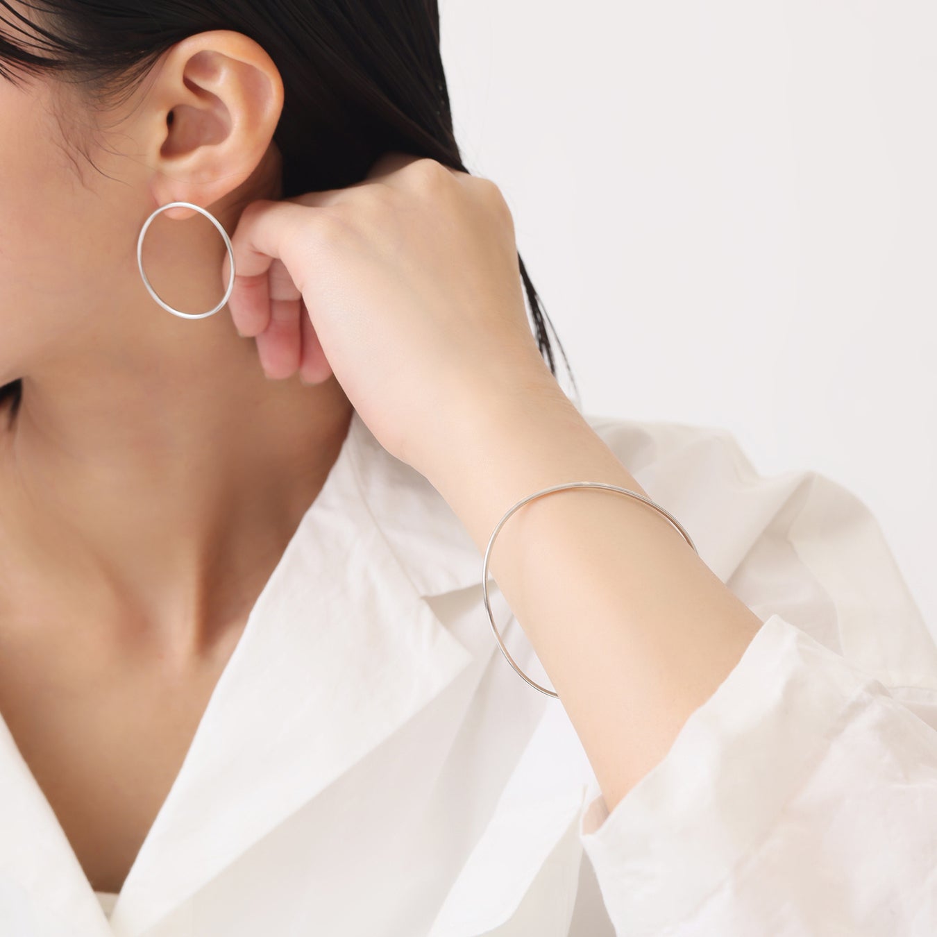 バングルとピアスは、職人の高度な技術によって、繋ぎ目のないシルエットに仕上げました。