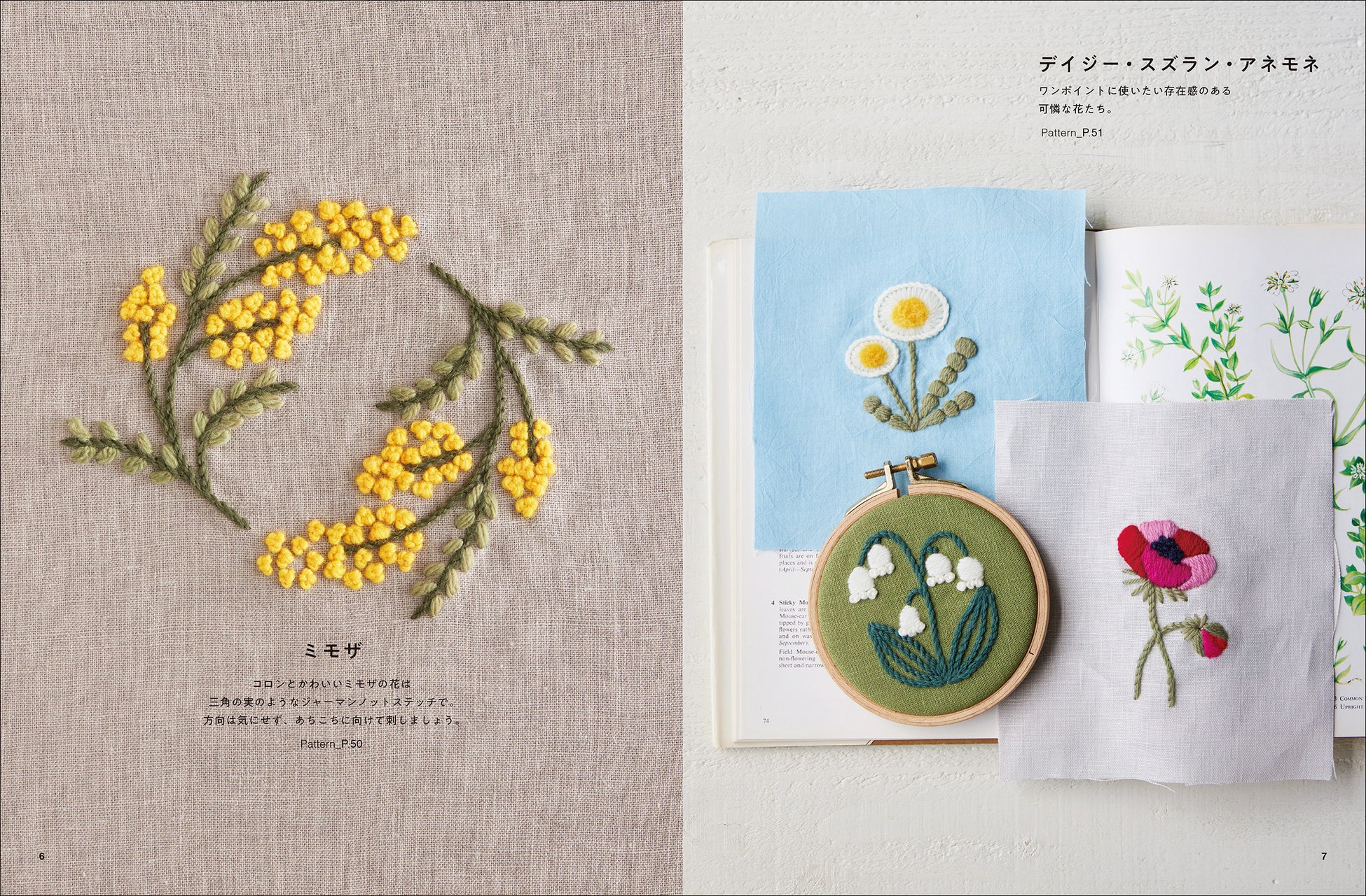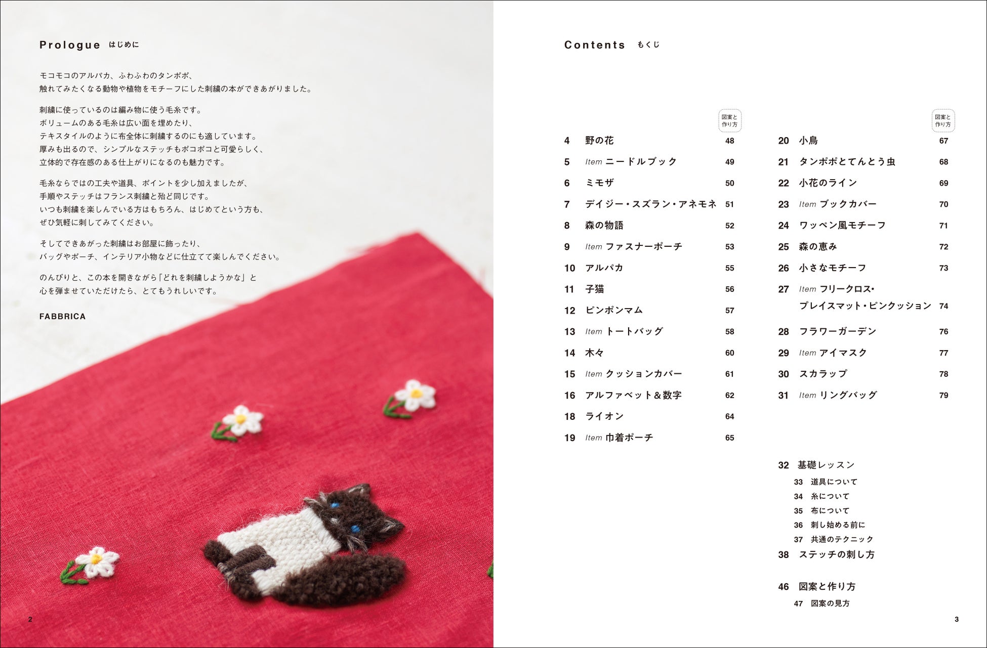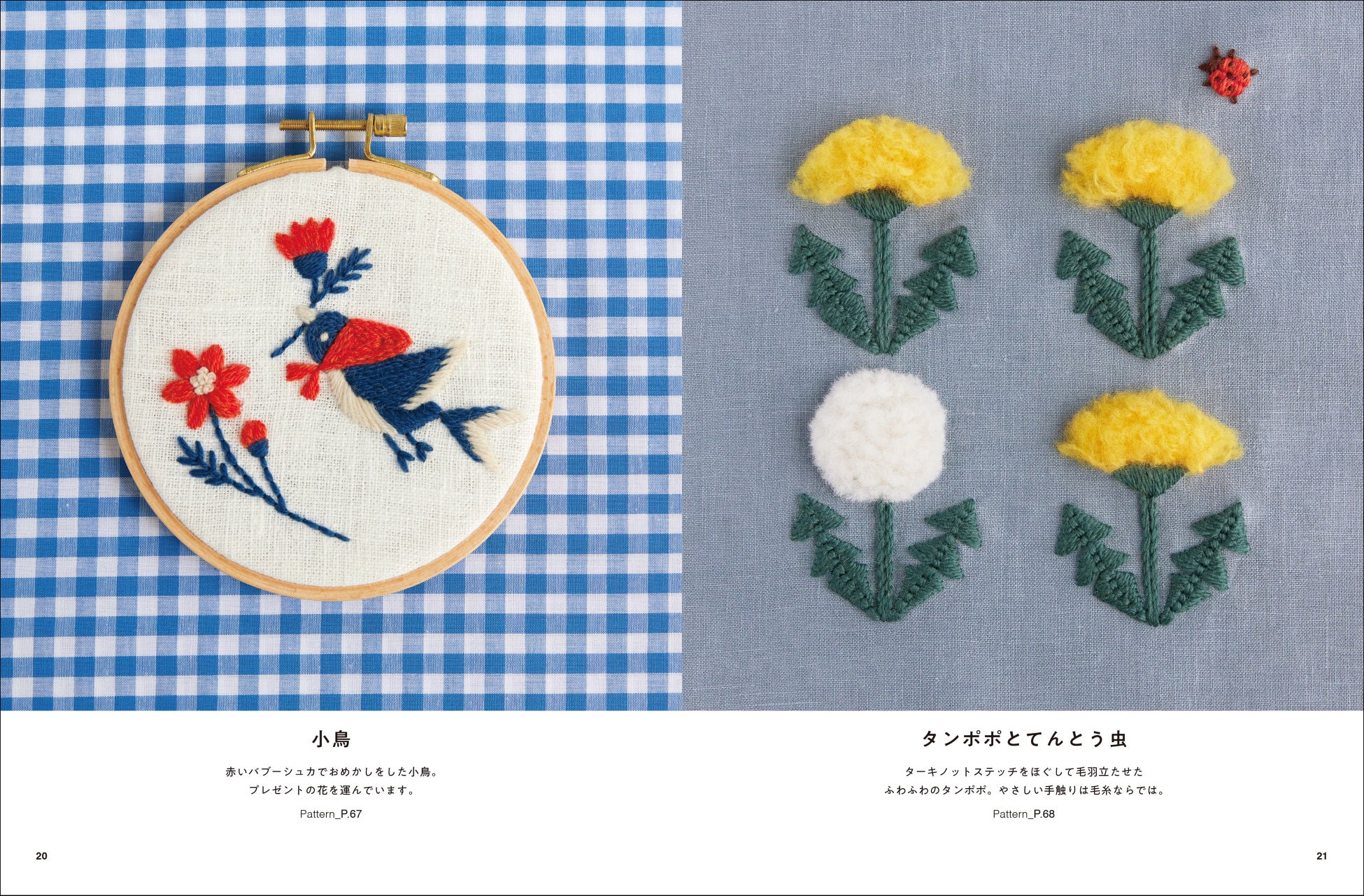 モチーフはアルパカ、ねこ、ライオン、鳥などの動物と、花や草木などの植物。基本的なステッチを中心に使った、初めてでも挑戦しやすい図案を集めました。