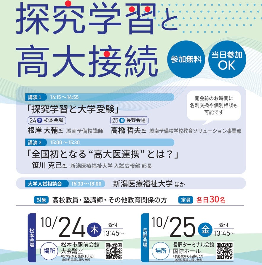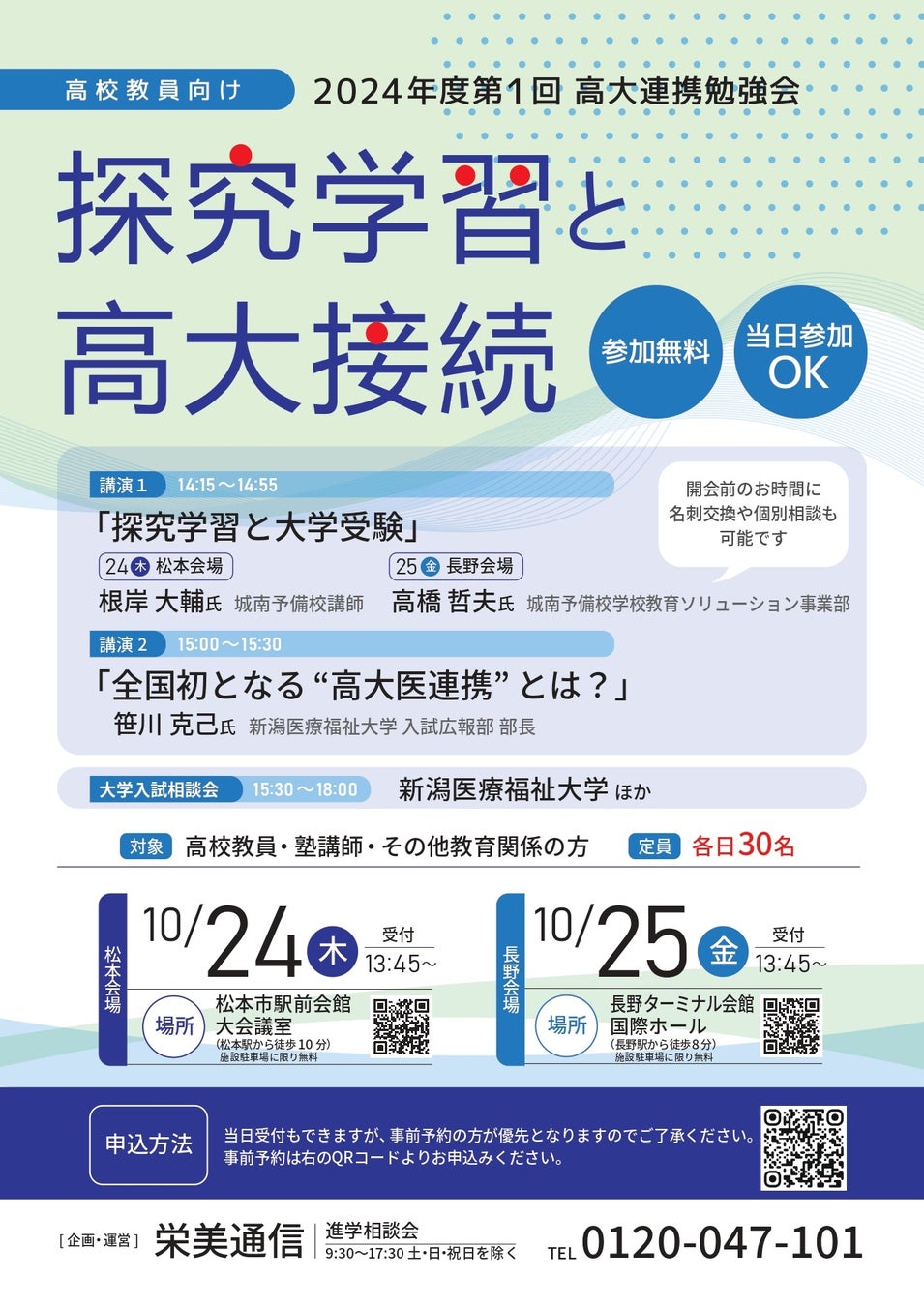 NSGグループの新潟医療福祉大学は、10月24日(木)と25日(金)、長野県の2都市で、「探究学習と高大接続」をテーマに高校教員などを対象とした「高大連携勉強会」を開催します。