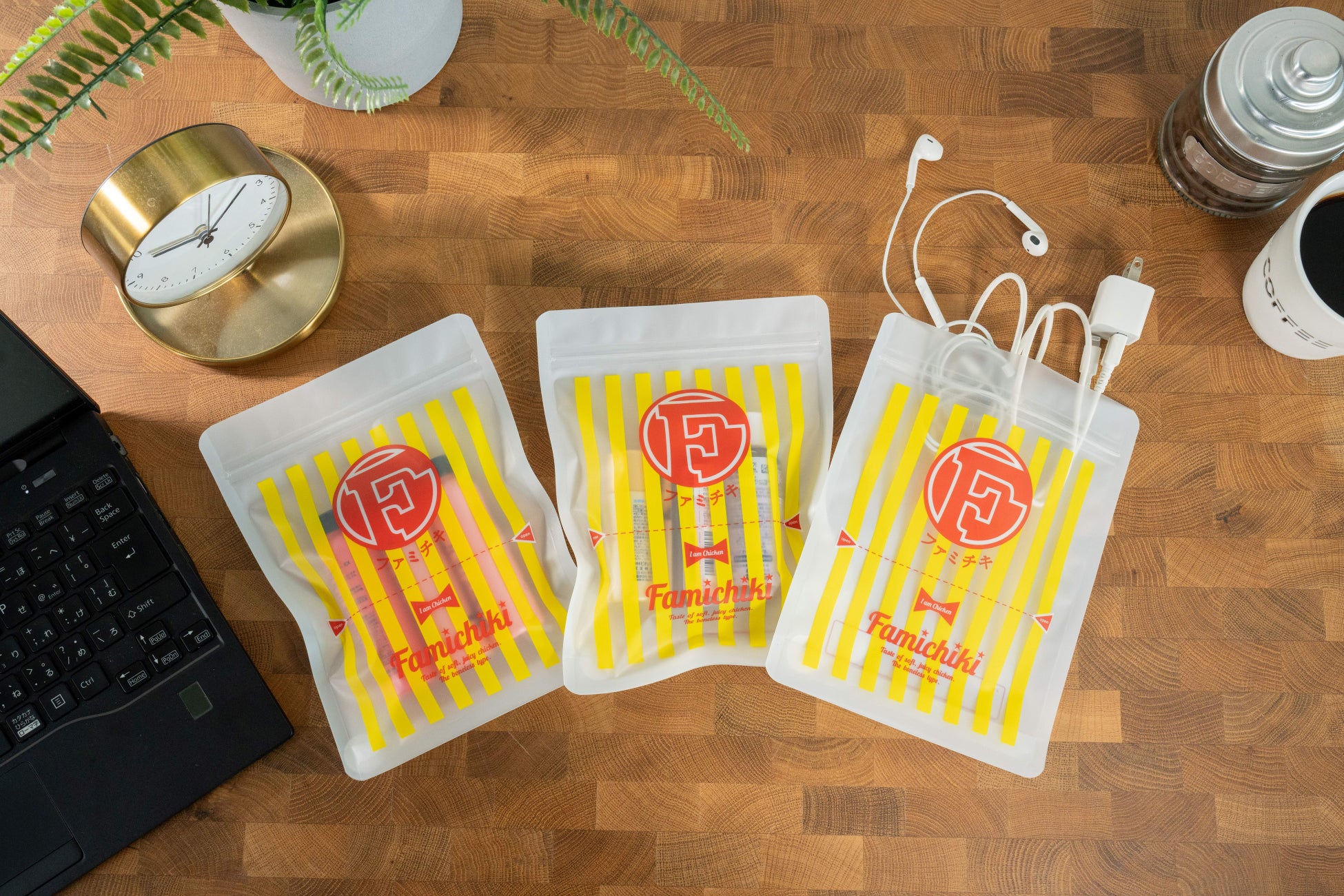 今回の福袋の中身のファミチキオリジナルグッズ5点は、すべてホットスナック袋(以下、ファミチキ袋)をイメージしたデザインで、白と黄色のストライプ柄が目を引くデザインになっています。