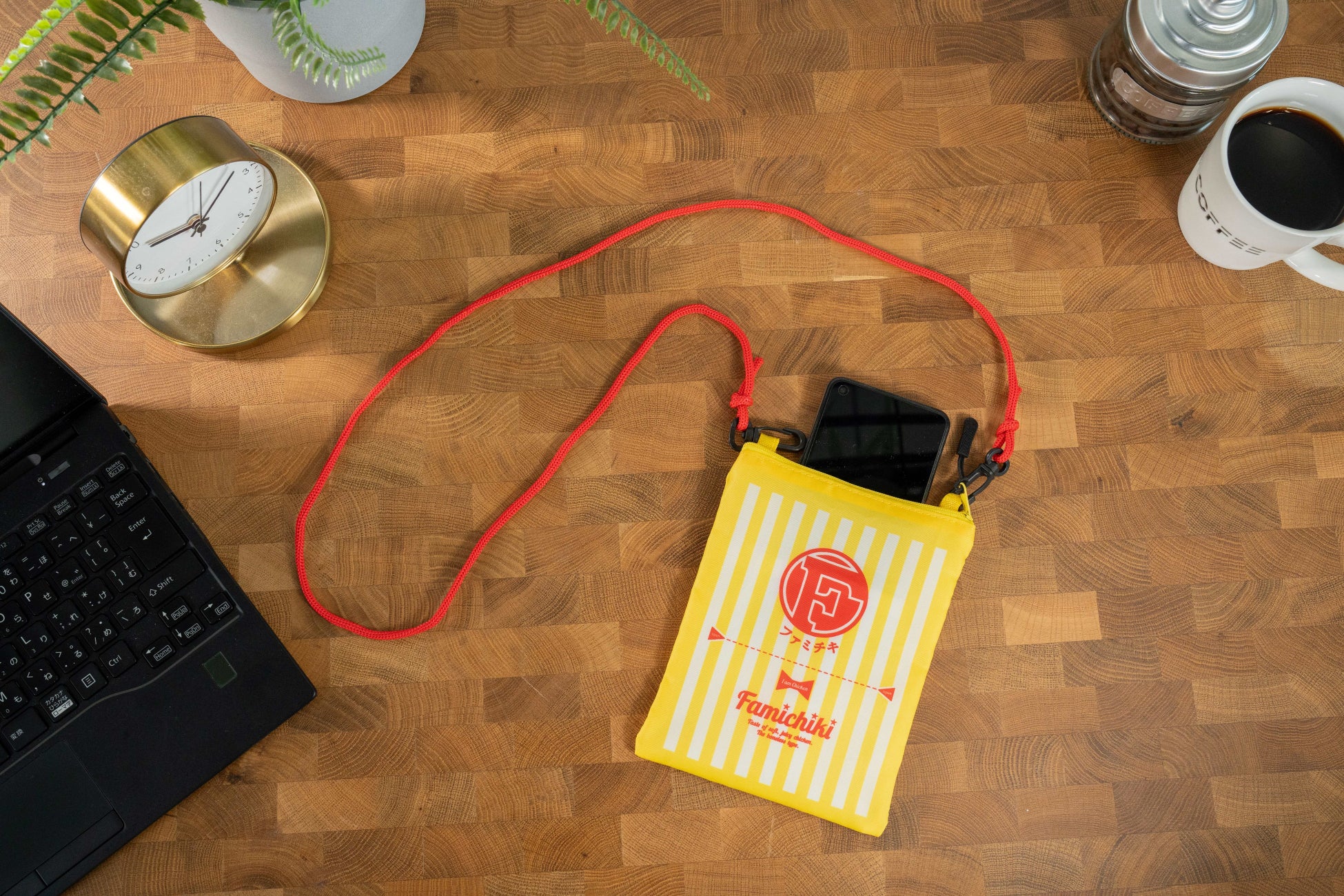 【内容】ファミチキ袋デザインで、お出かけ時に両手が使える肩掛けタイプのフラットなサコッシュです。