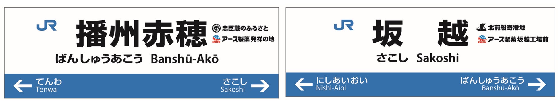 西日本旅客鉄道株式会社(本社:大阪市北区、代表取締役社長:長谷川 一明)、株式会社JR西日本コミュニケーションズ(本社:大阪市北区、代表取締役社長:伊藤 義彦)は、設立100周年を迎えるアース製薬株式会社(本社:東京都千代田区、代表取締役社長 CEO:川端克宜)との取り組みとして、2025年6月4日(水)から、兵庫県赤穂市にある播州赤穂駅と坂越駅で、駅名標を活用した広告として、「忠臣蔵のふるさと アース製薬 発祥の地」(播州赤穂駅)、「北前船寄港地 アース製薬 坂越工場前」(坂越駅)を掲出しました。