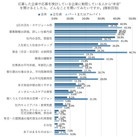 応募した企業や応募を検討している企業に勤務する人の本音で、どんなことを聞いてみたいかきいた(複数回答)。全体で最も多かったのは「1日の流れ・スケジュール例」で40.9%、次いで「募集職種の詳細、詳しい仕事内容」が40.3%、「社内の活気、雰囲気」が38.9%となった。いずれも求人内容のアピール部分に詳細が載っていることが多いが、「本当のところはどうか」働く人の話から確かめたいようだ。