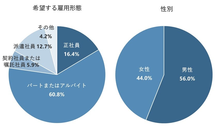 一方、「女性」のほうが「男性」よりも「希望する仕事内容だから」が11.5pt、「希望の勤務時間帯だから」と 「扶養の範囲内で働けるから」が10.0pt高くなった。勤務可能な時間帯や収入に制限があっても勤めていける職場を探している人が男性より目立った。
