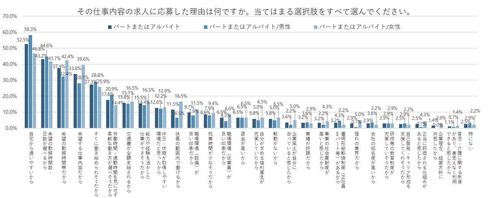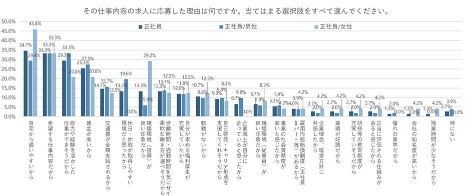 一方、「女性」のほうが「男性」よりも「職場環境(設備)が良い印象だから」が23.3pt、 「自宅から通いやすいから」が16.4pt高くなった。仕事を進める環境を重視して選んでいる人が、男性よりも高い割合となった。